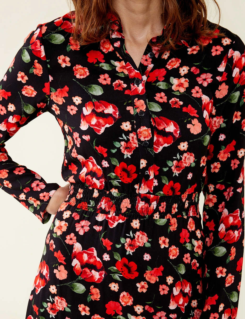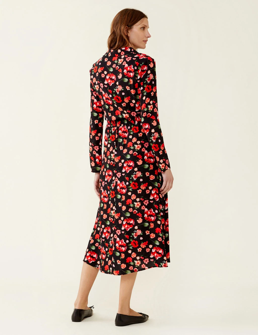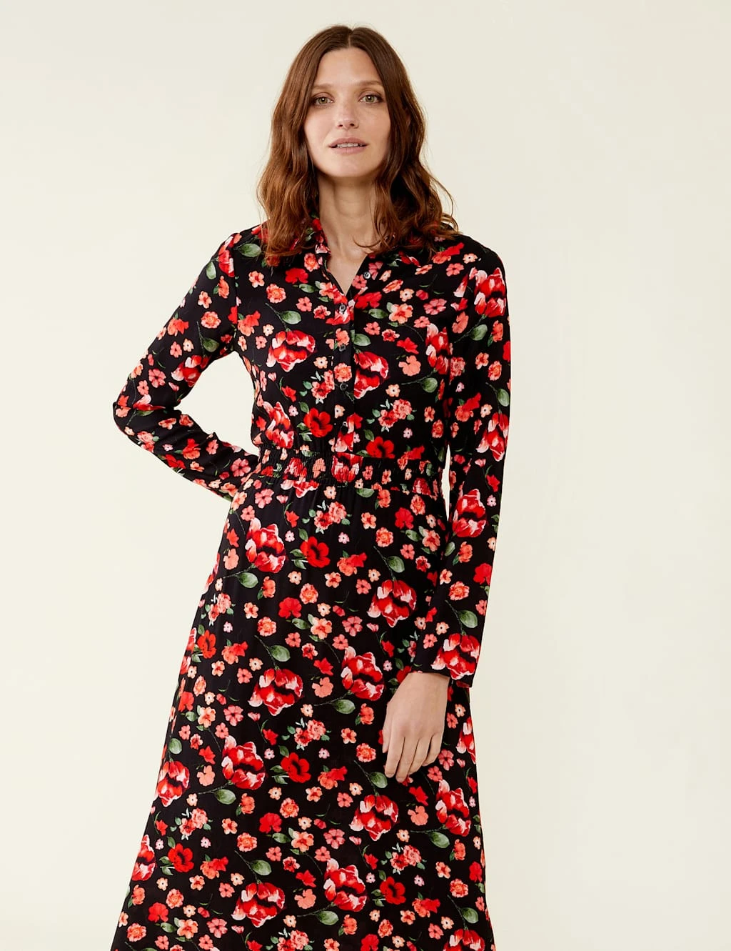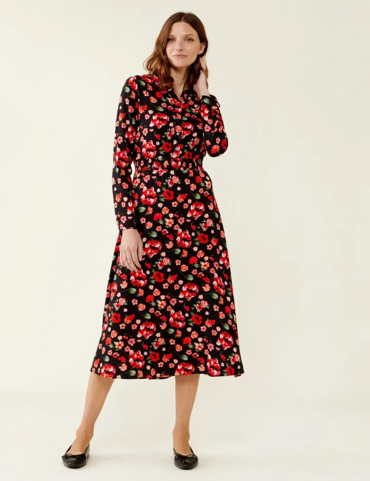 Slip into this tea dress by Finery London for an effortless look you can wear every day. It’s cut in a regular fit with an elegant midi hem. A bright floral print offers a fun pop, while a stretchy waistband cinches in the fabric for a flattering shape. Long sleeves, a collared neck and button placket create a smart finish.