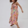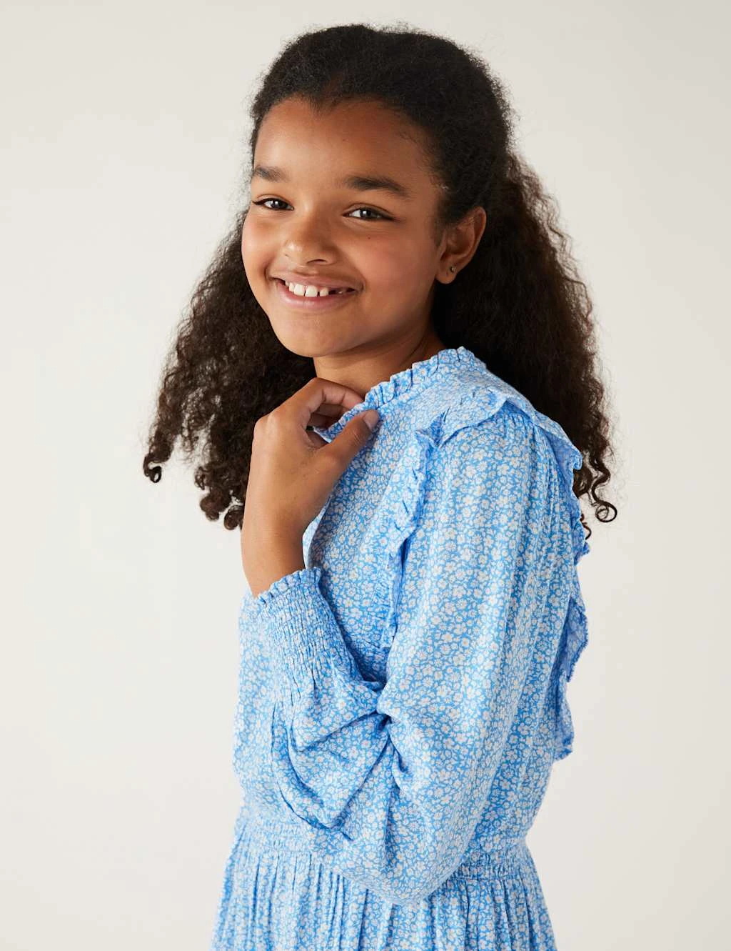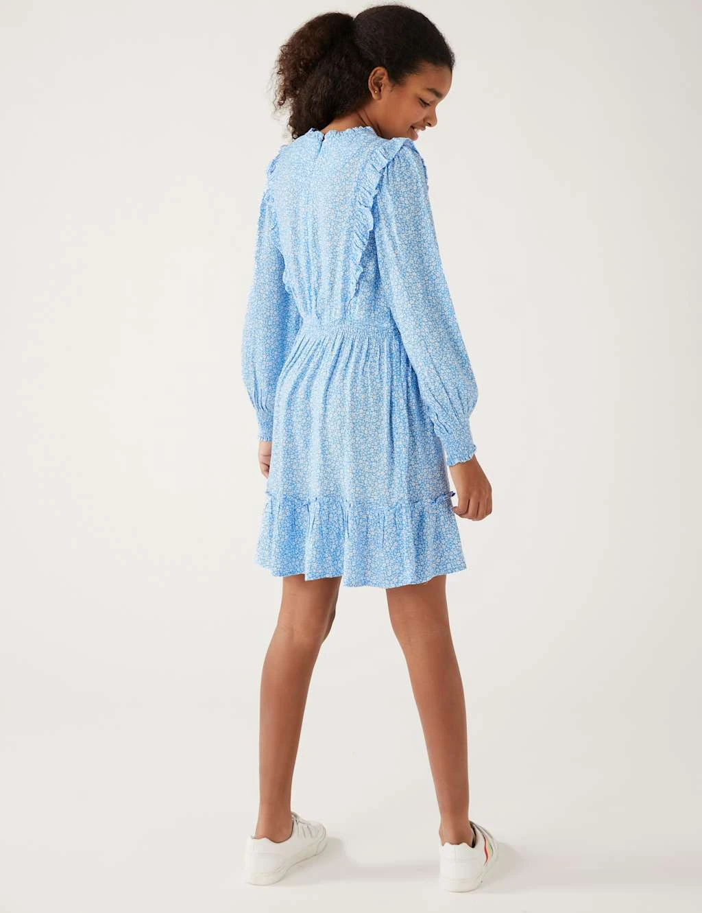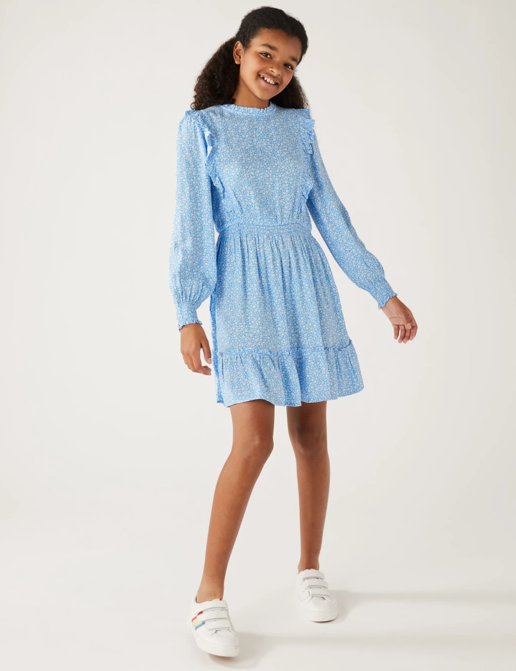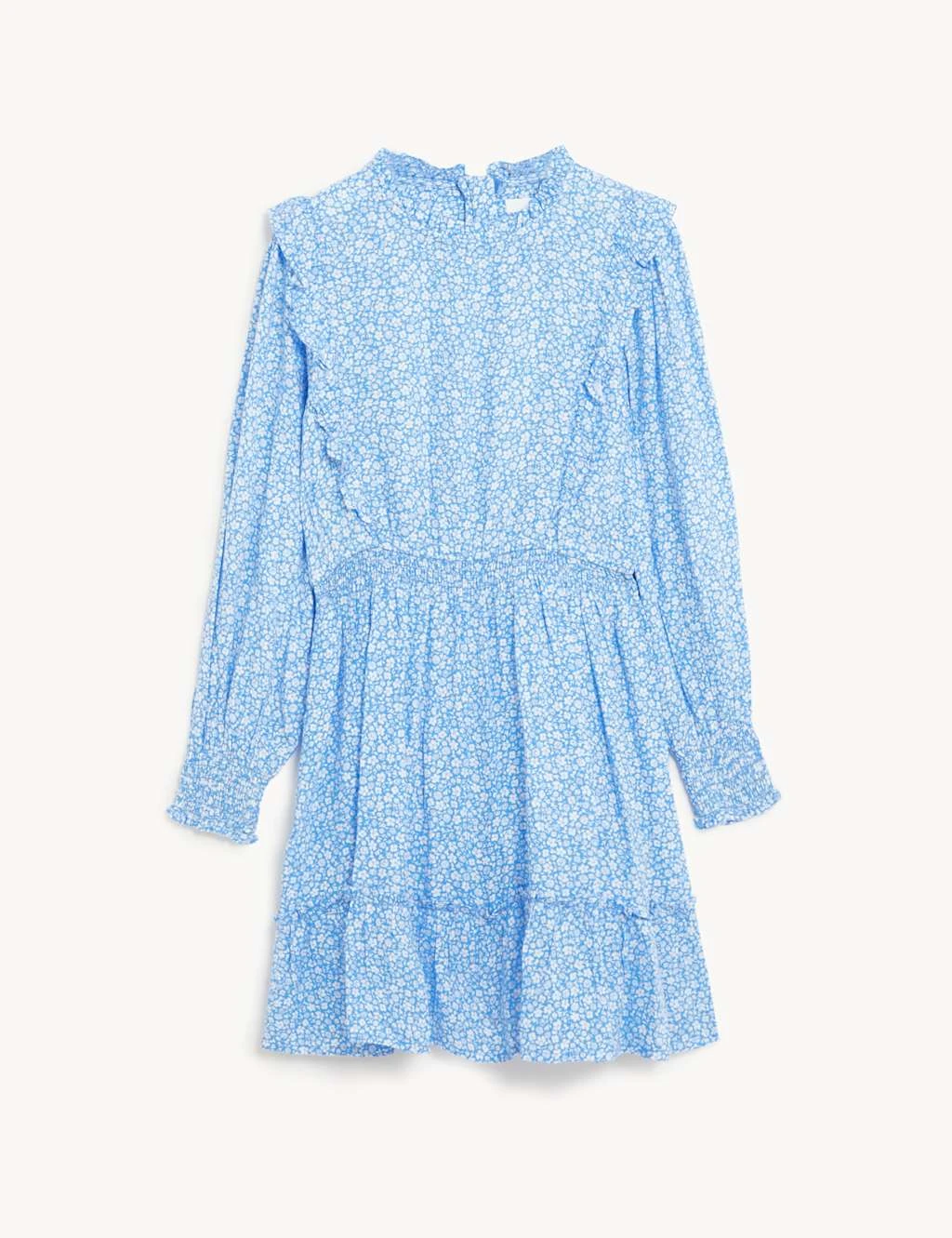 We’ve crafted this long-sleeved dress from floral fabric for a fun effect. Regular fit, with a stretchy waist for comfort. It features ruffles at the high neck, elasticated cuffs and down the front for a playful finish.