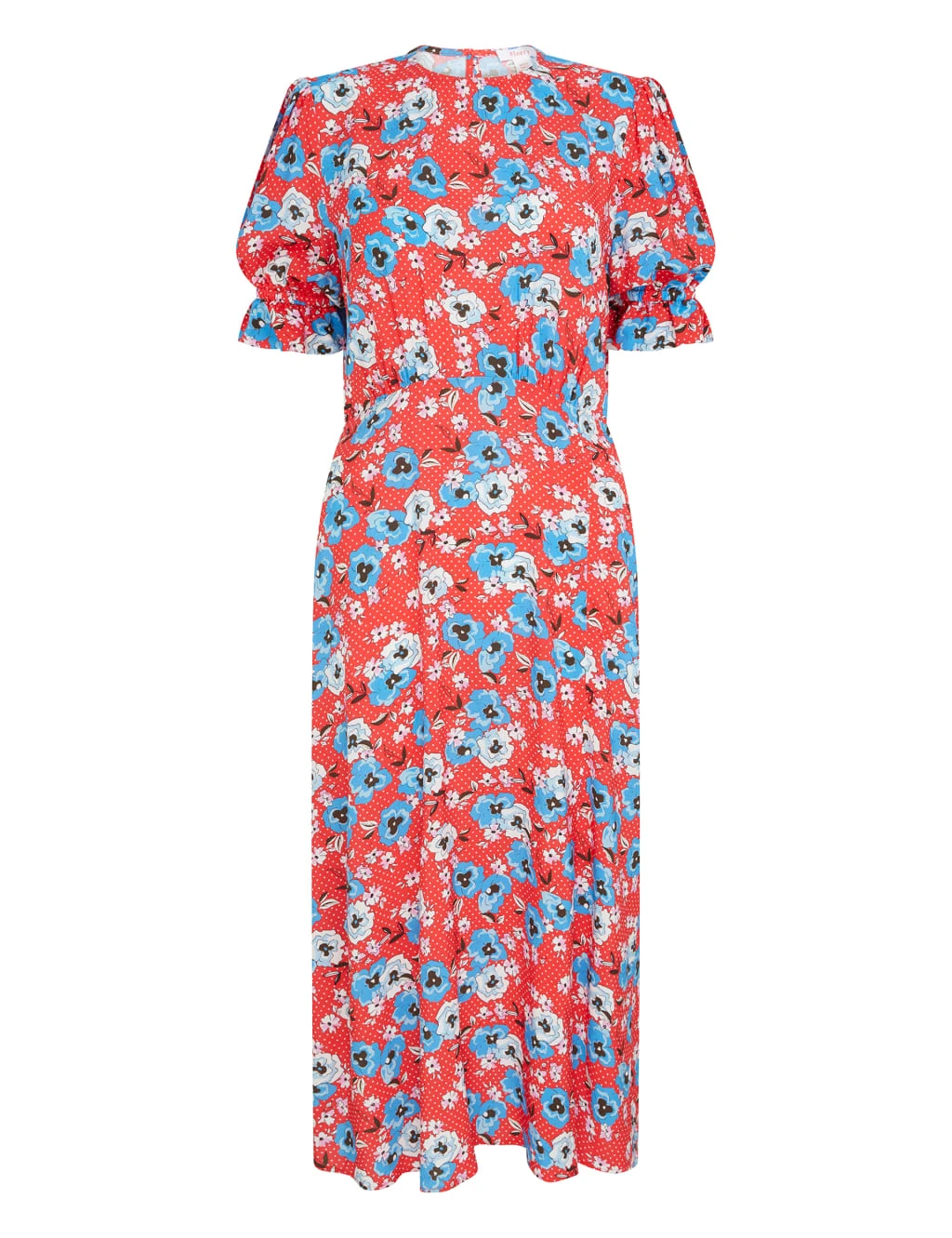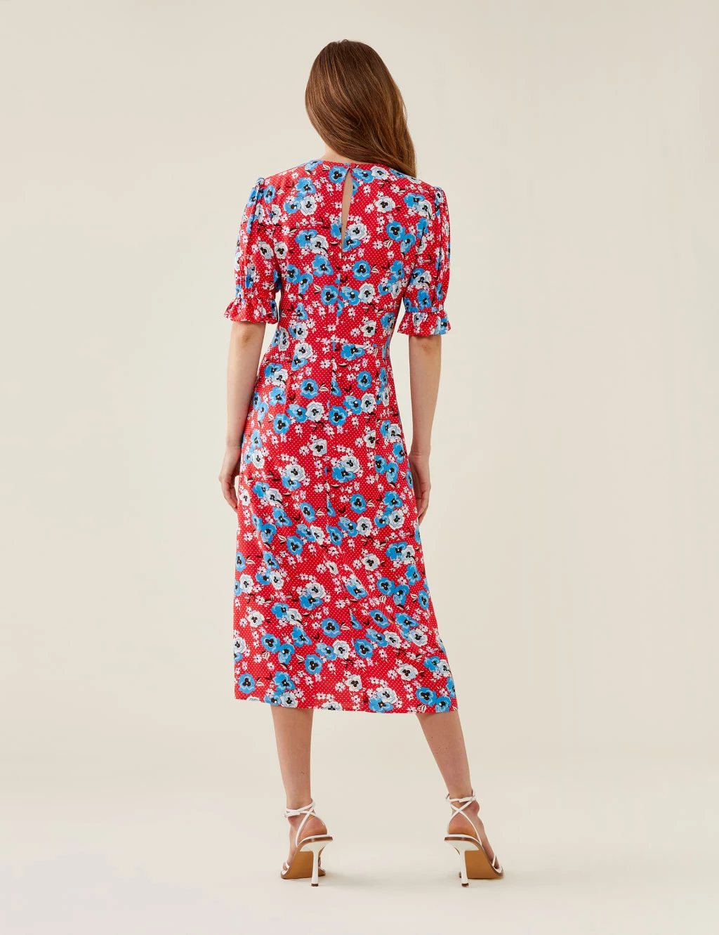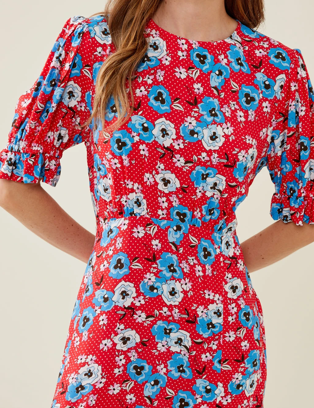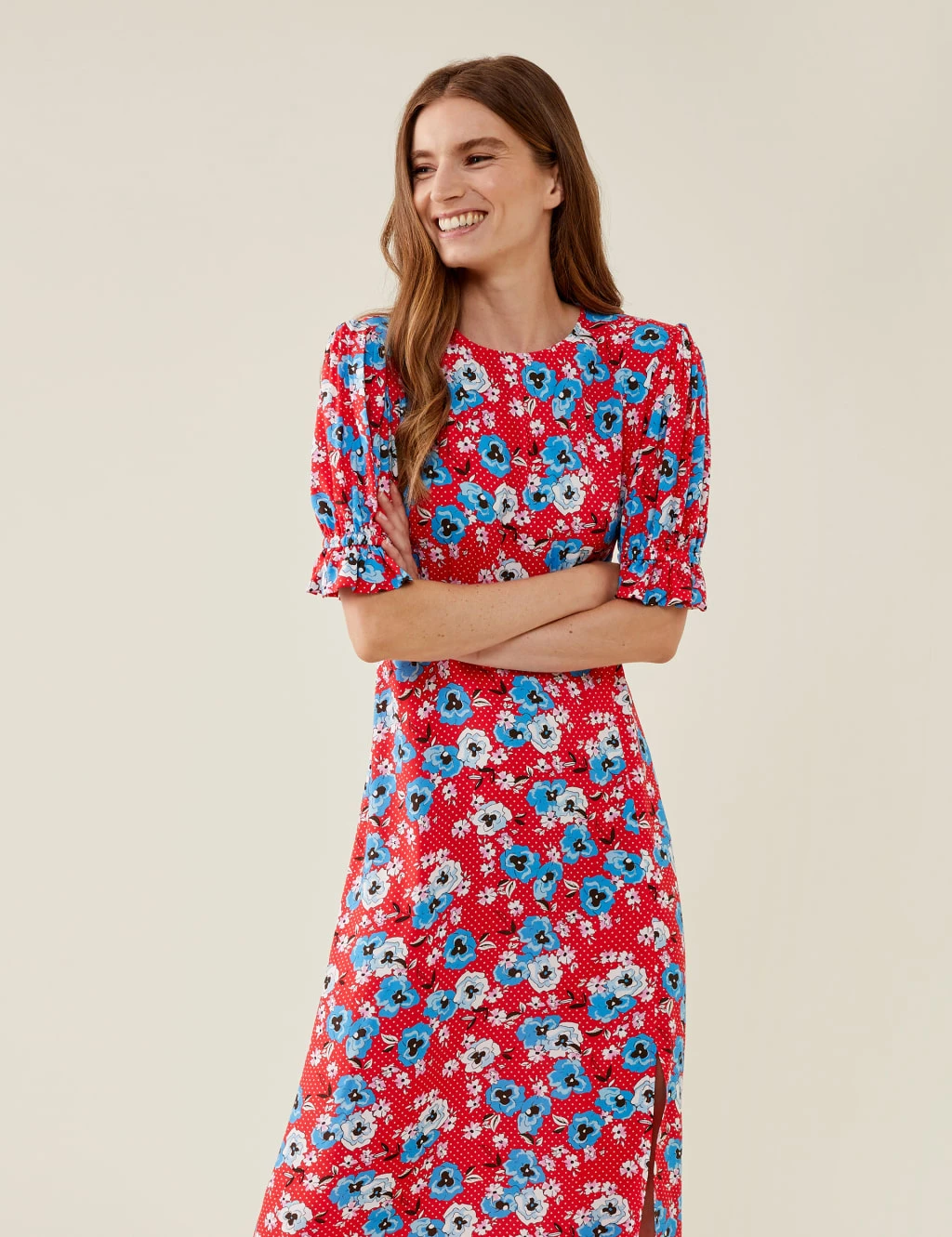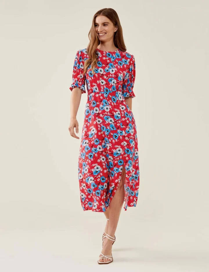 With its polka dots and painterly florals, this tea dress from Finery London can be effortlessly dressed up or down. It’s designed in a comfy regular fit with a classic round neck and short sleeves. Shirred detailing and frilled trims on the cuffs elevate the look. This piece falls to an elegant midi length and features a small side split so you can swish through the day.
