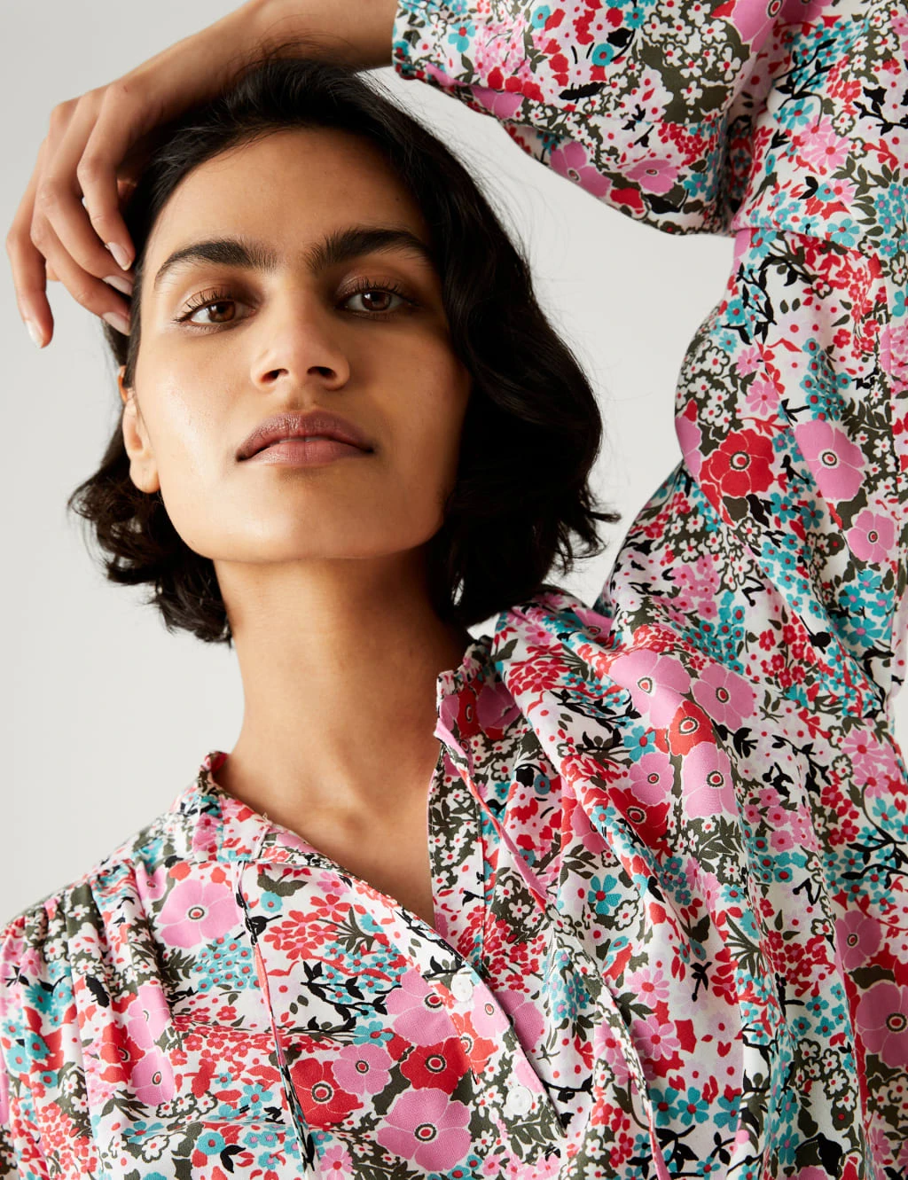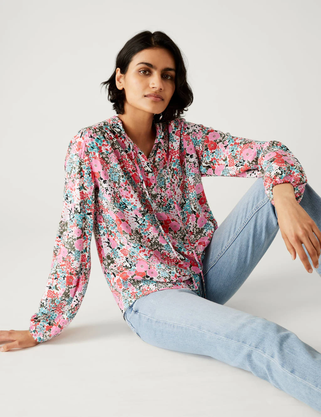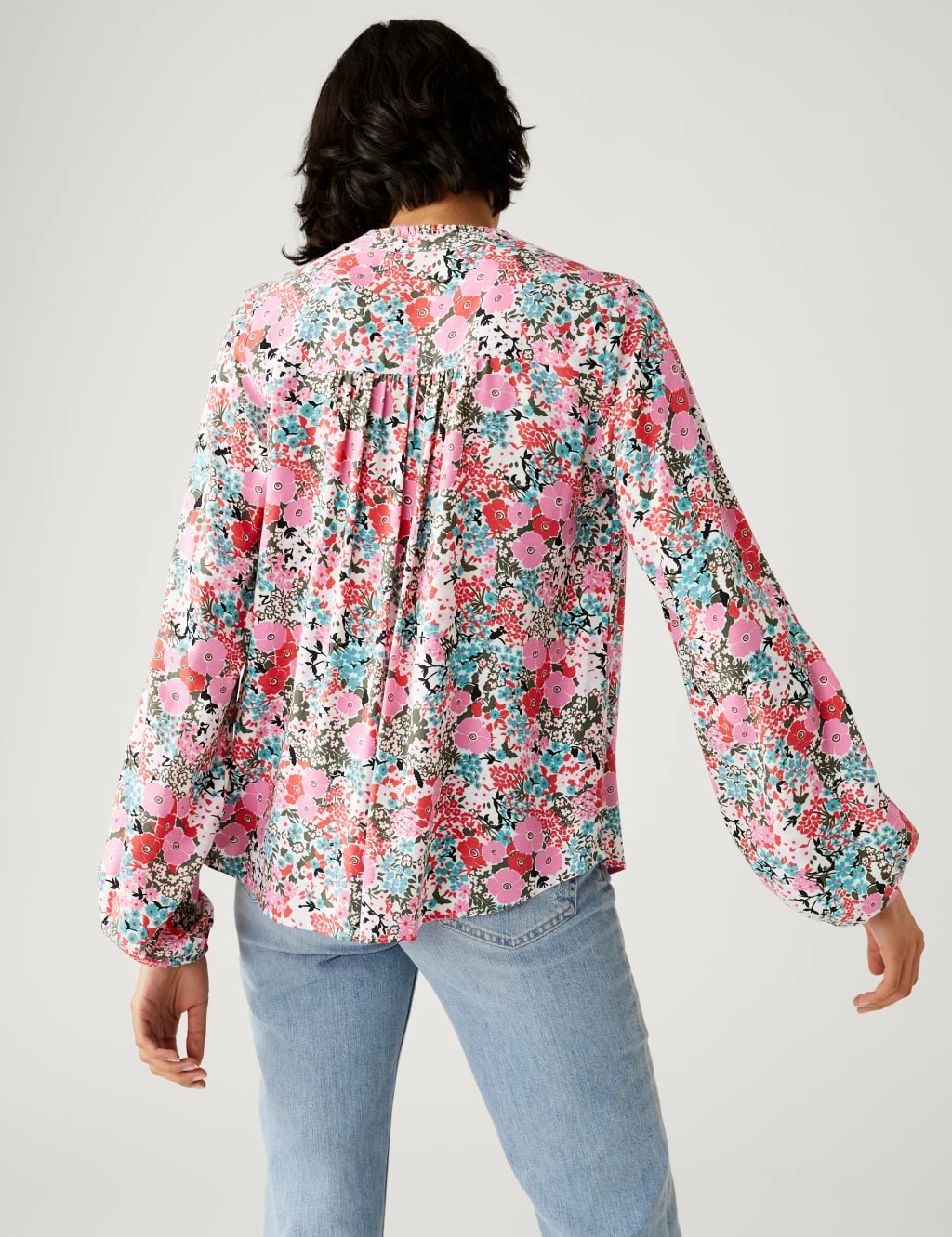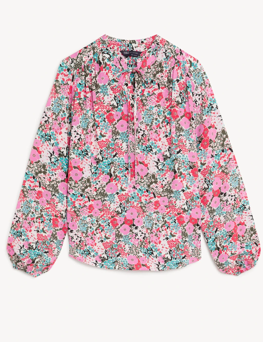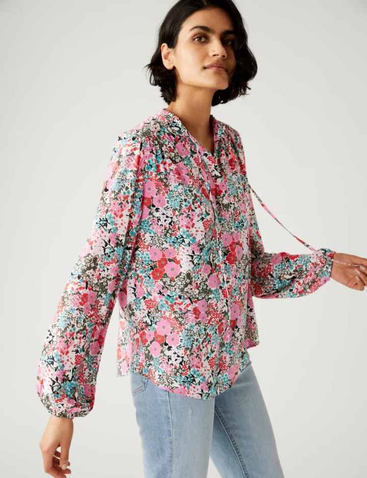 An all-over floral print brings a fresh feel to this stylish longline blouse. It’s designed in an easy relaxed fit, with a tie fastening and delicate frill at the neckline. Gathered cuffs add subtle volume to the long sleeves for a billowy finish.