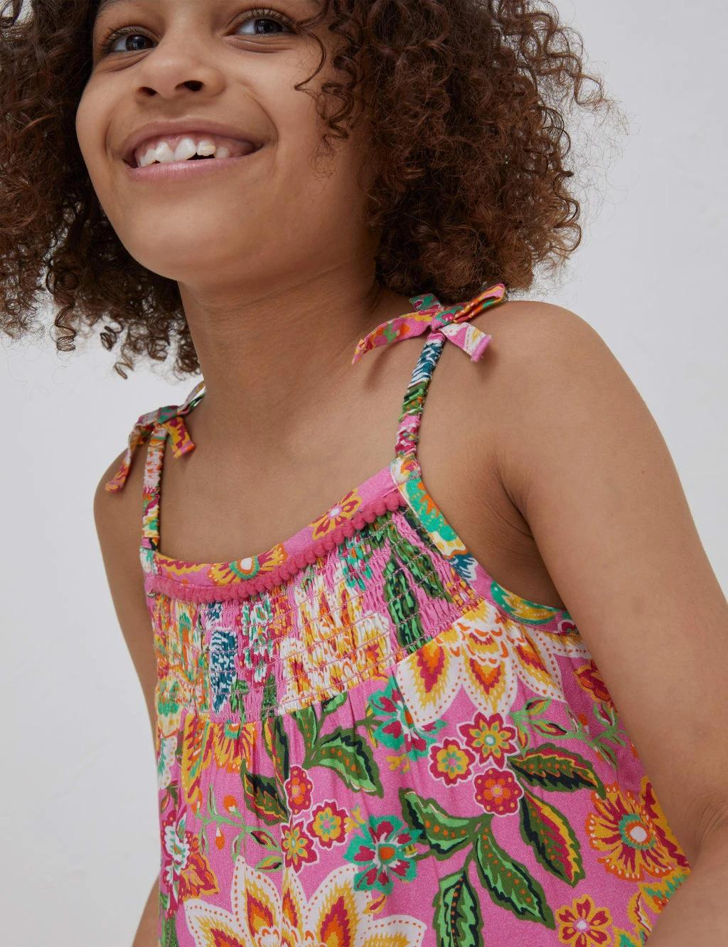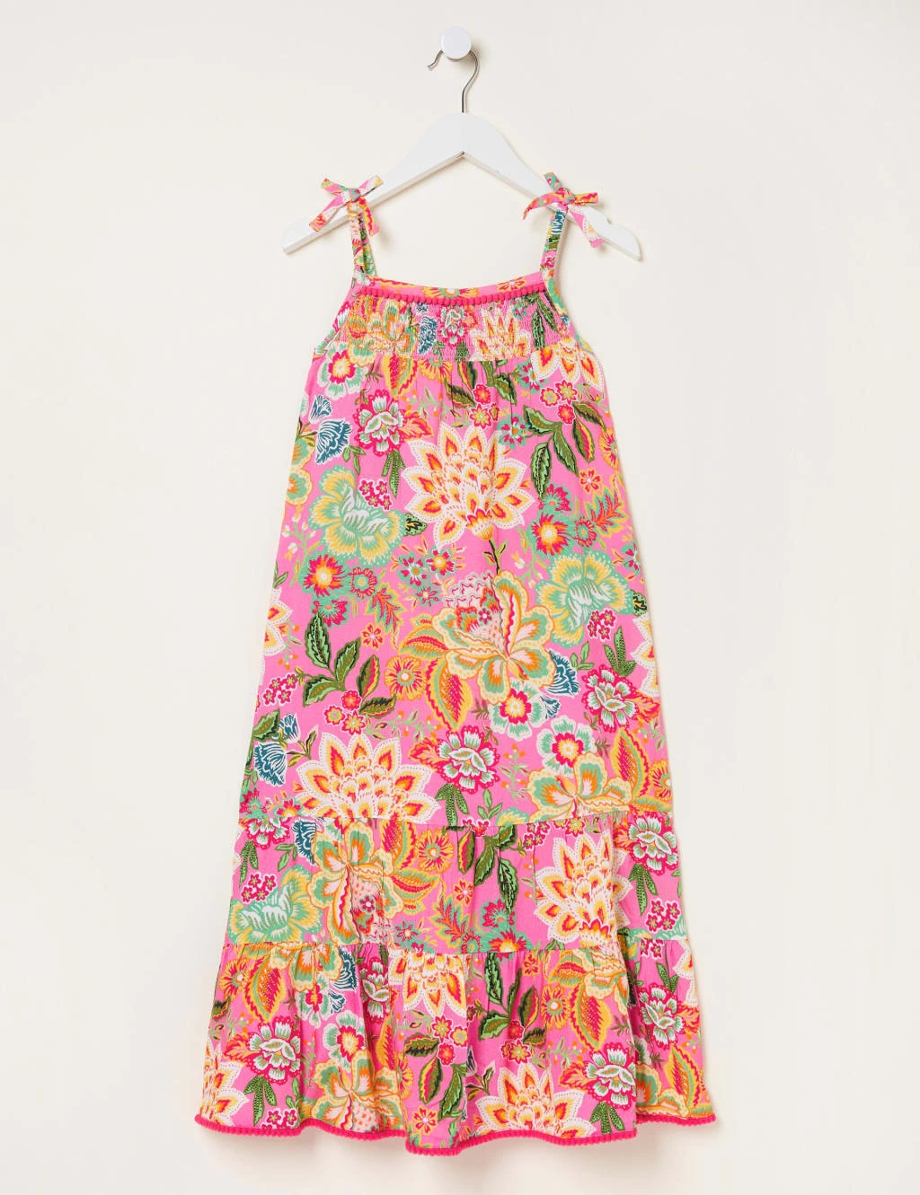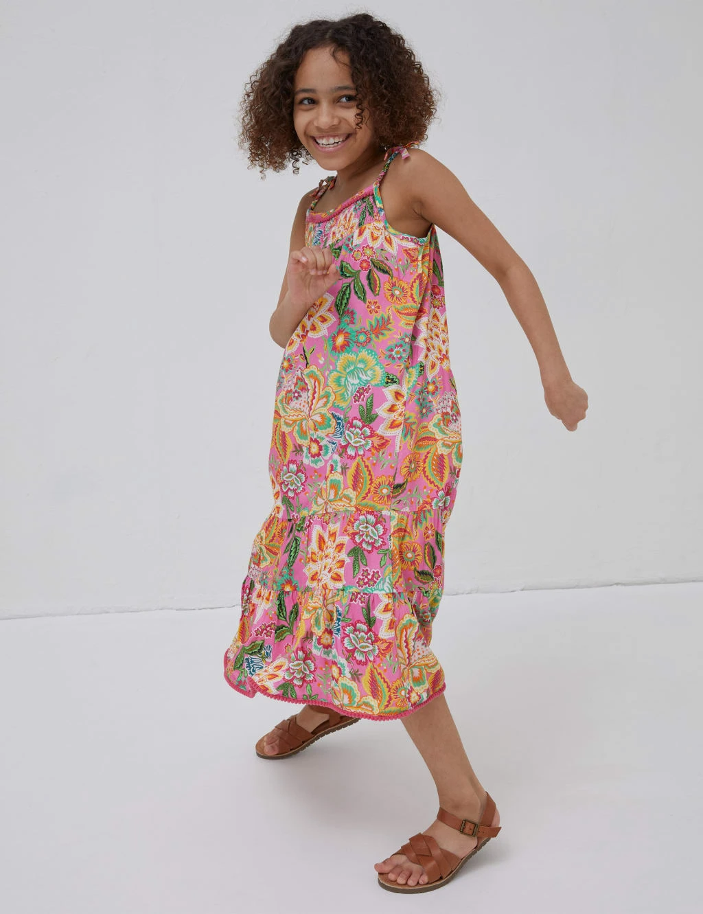 A bright floral print brings a vibrant feel to this pretty dress from FatFace. The sleeveless style is fully lined and cut in a comfy regular fit, with delicate bows on the shoulder straps. Shirred detailing adds a sweet touch to the square neckline, while the tiered skirt is full of easy movement.