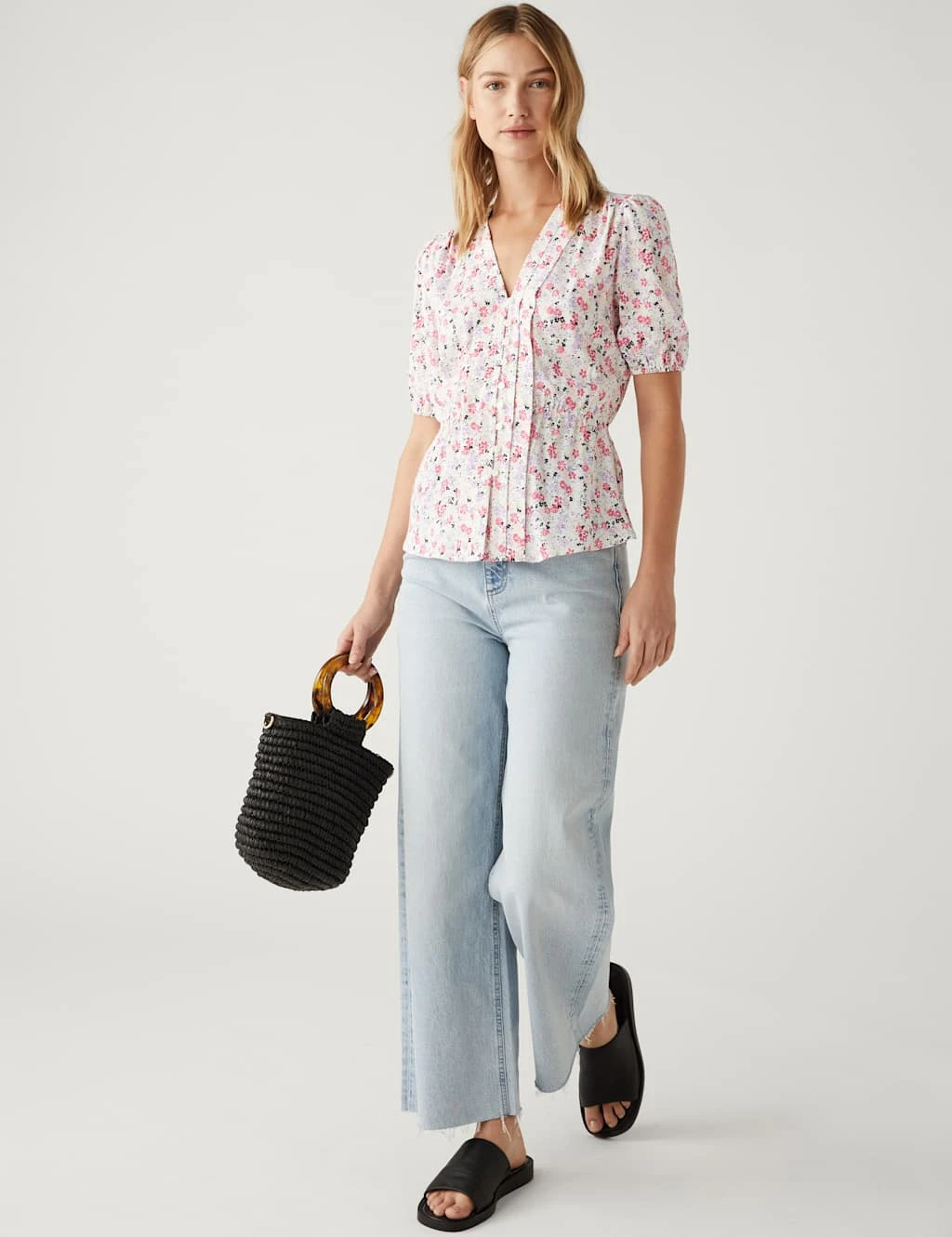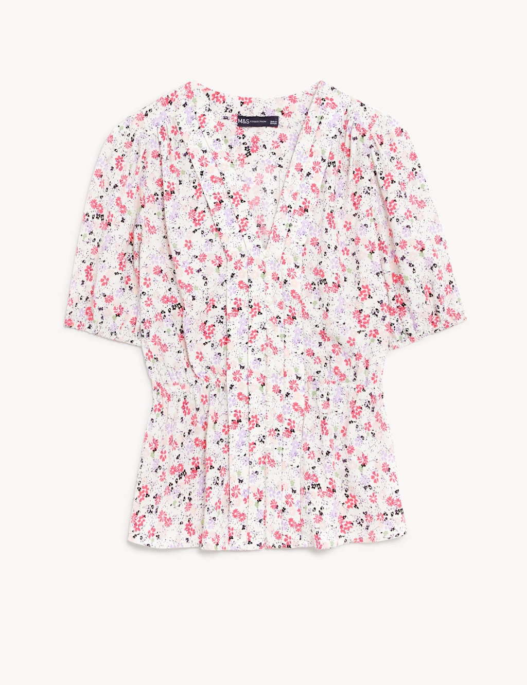 Our pretty floral blouse has a waisted shape for a flattering look. It’s cut in a regular fit, with full 3/4-length sleeves that finish in elasticated cuffs for comfort. The smart v-neck features pintuck pleats, giving the bodice extra textured detail. It fastens up the front with a row of neat little buttons.
