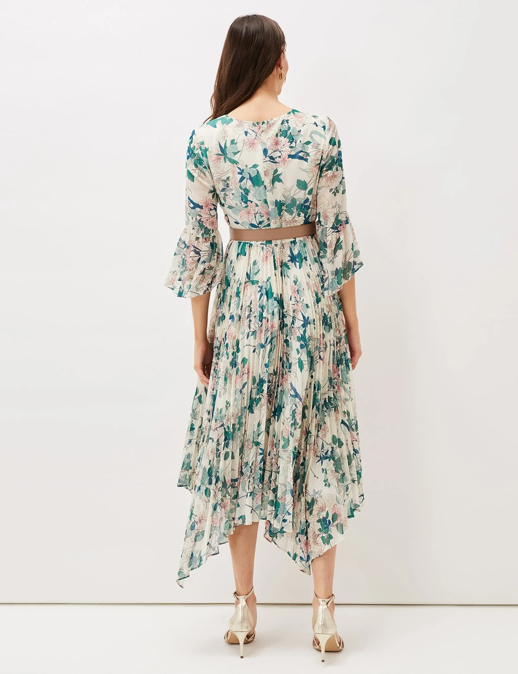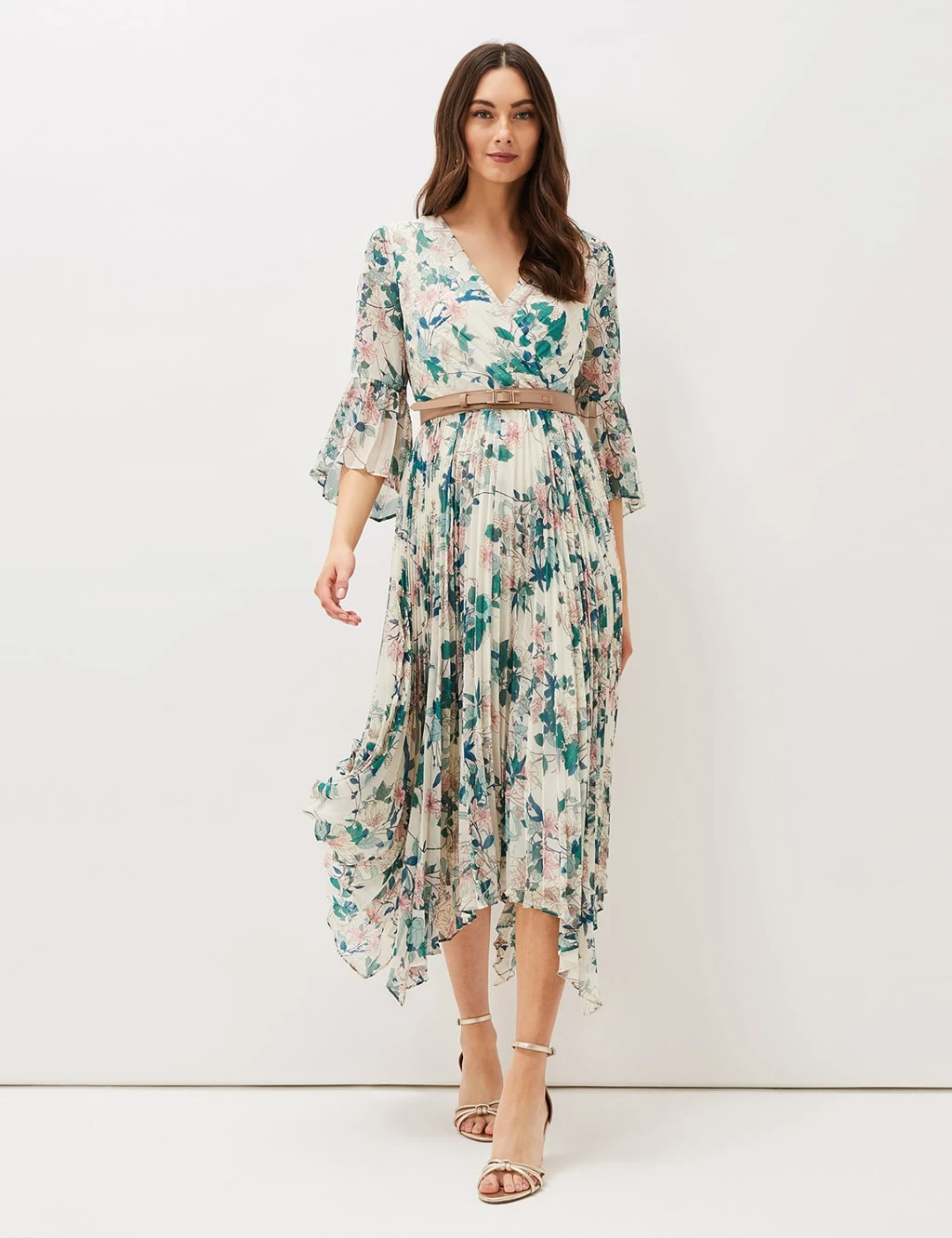 This Phase Eight dress is printed with a lush floral motif woven through with a touch of glitter, for a gorgeously romantic look. It’s cut in a comfortable regular fit, in a flattering waisted style that’s emphasised by a slim leather belt. Deeply frilled three-quarter sleeves and a v-neckline ensure a feminine air. The midi-length skirt is pleated for plenty of fluttery movement. This dress is lined for extra coverage, and fastens with a back zip.