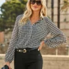 Amp up evening outfits with this popover blouse from French Connection. It’s made in a comfy relaxed fit with side splits at the hem for feminine movement. This checked piece has smocking on the shoulders and patterned stitching for a hand-crafted look. It’s complete with a classic collar, a six-button placket and long, blouson sleeves with stretchy shirred cuffs.