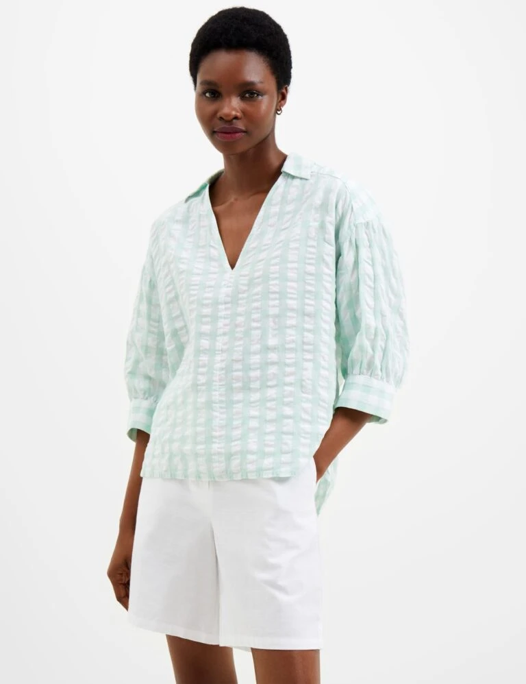 Crafted from textured seersucker fabric with a checked design, this French Connection shirt is perfect for warmer days. It’s made in an easy regular fit with a dipped back hem for a flattering silhouette. This versatile piece is complete with three-quarter puff sleeves for added volume and a collared v-neckline for a relaxed look.