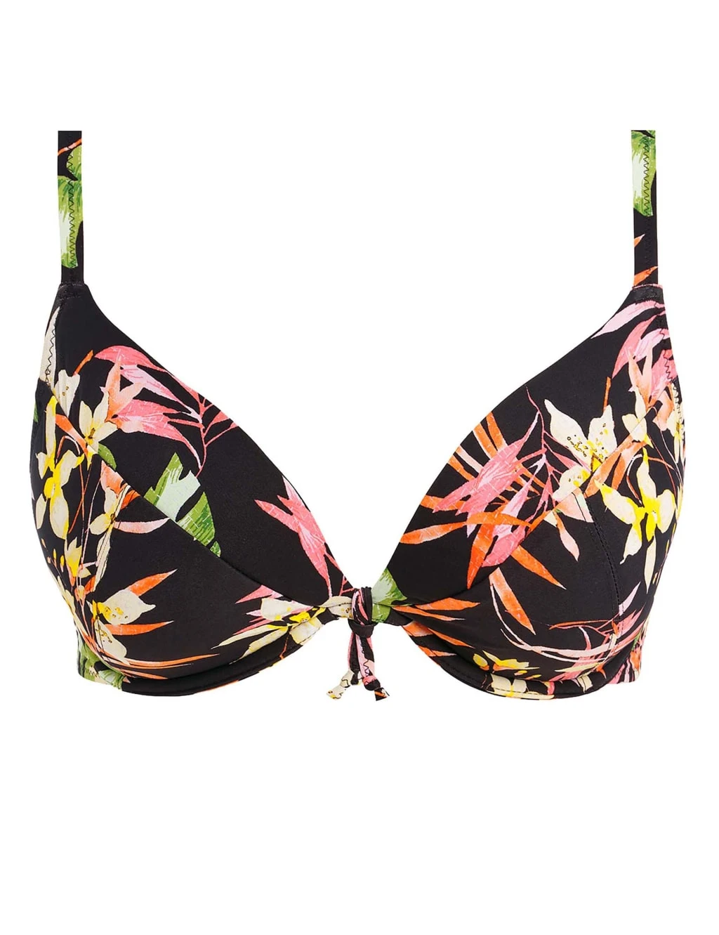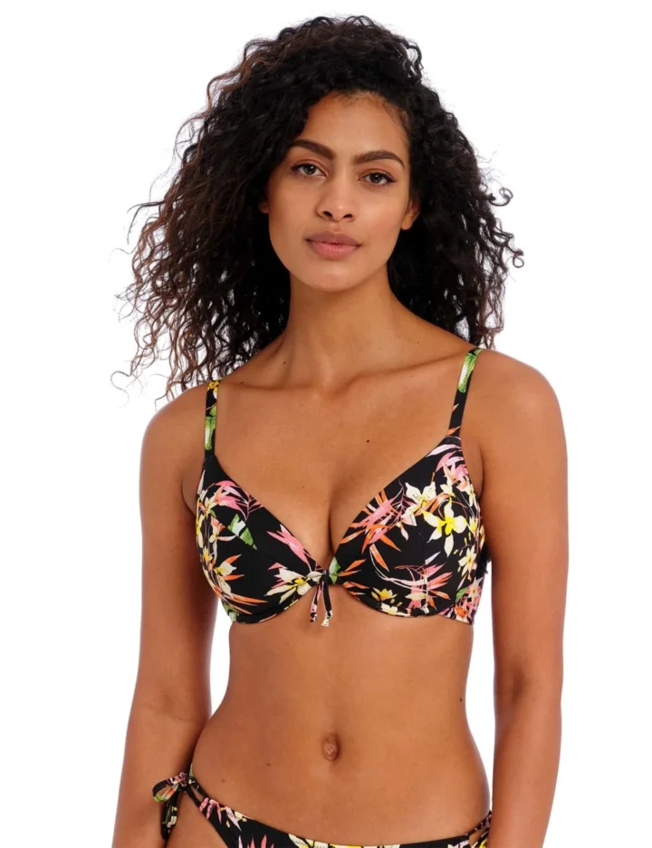With a colourful floral print, this Freya bikini top will turn heads at the pool. Underwired, lined cups and a plunging neckline offer a flattering look. The detachable multiway straps offer the option to wear them in a cross back style. Chlorine Resist Xtra-Life Lycra™ technology keeps your swimwear looking newer for longer.