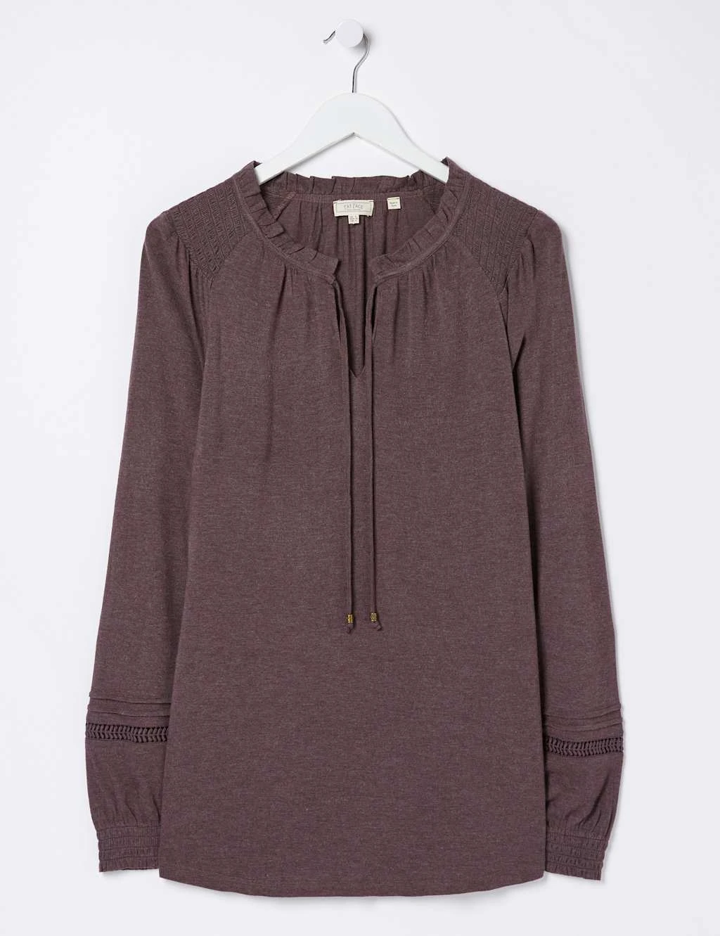 A timeless casual piece, this FatFace tunic brings off-duty versatility to your wardrobe. This regular-fit piece has a frill-trimmed notch neck that you can leave open or style with the tie fastening. It’s designed with long sleeves featuring leaf ladder detailing, plus flattering shirring at the shoulders and cuffs.