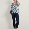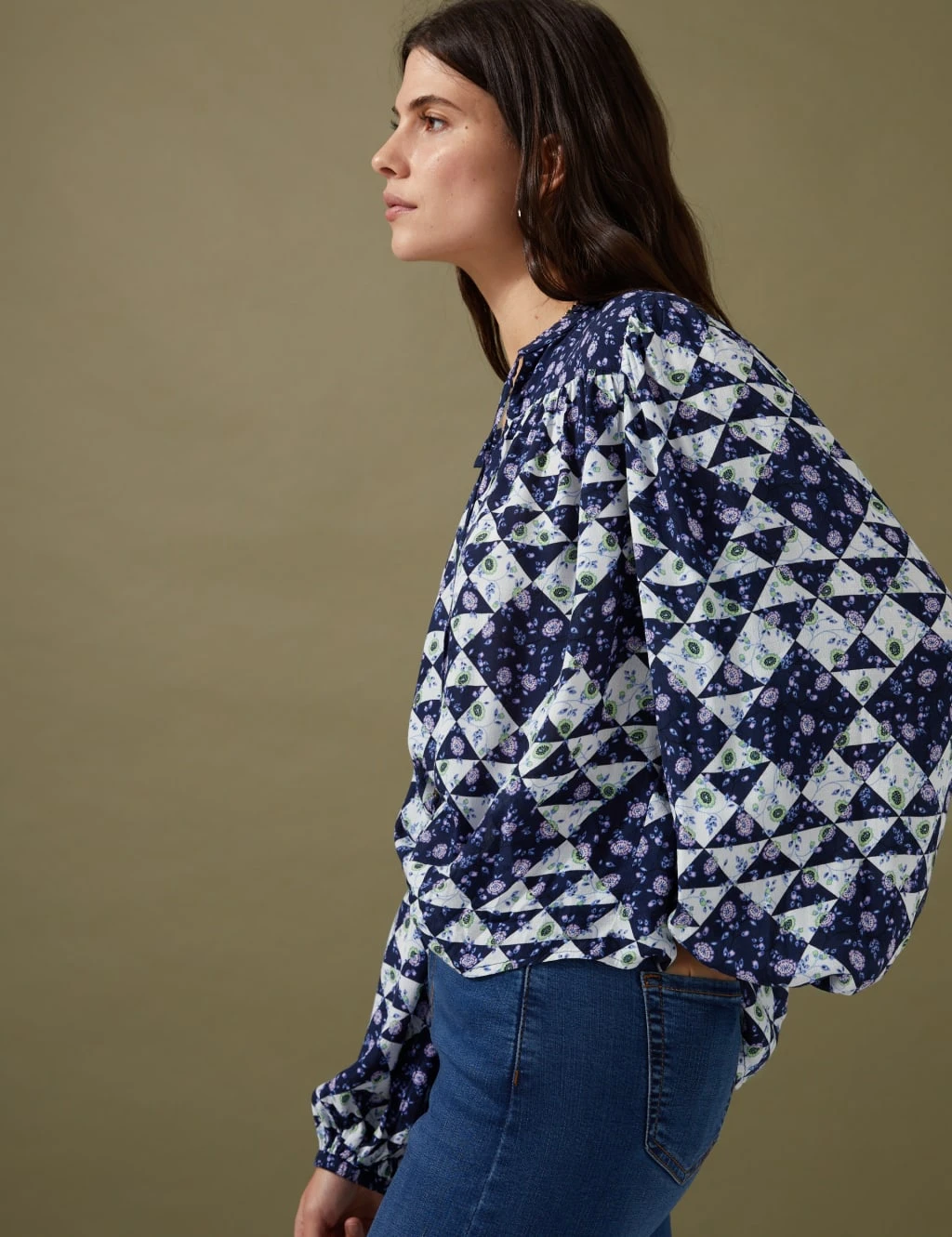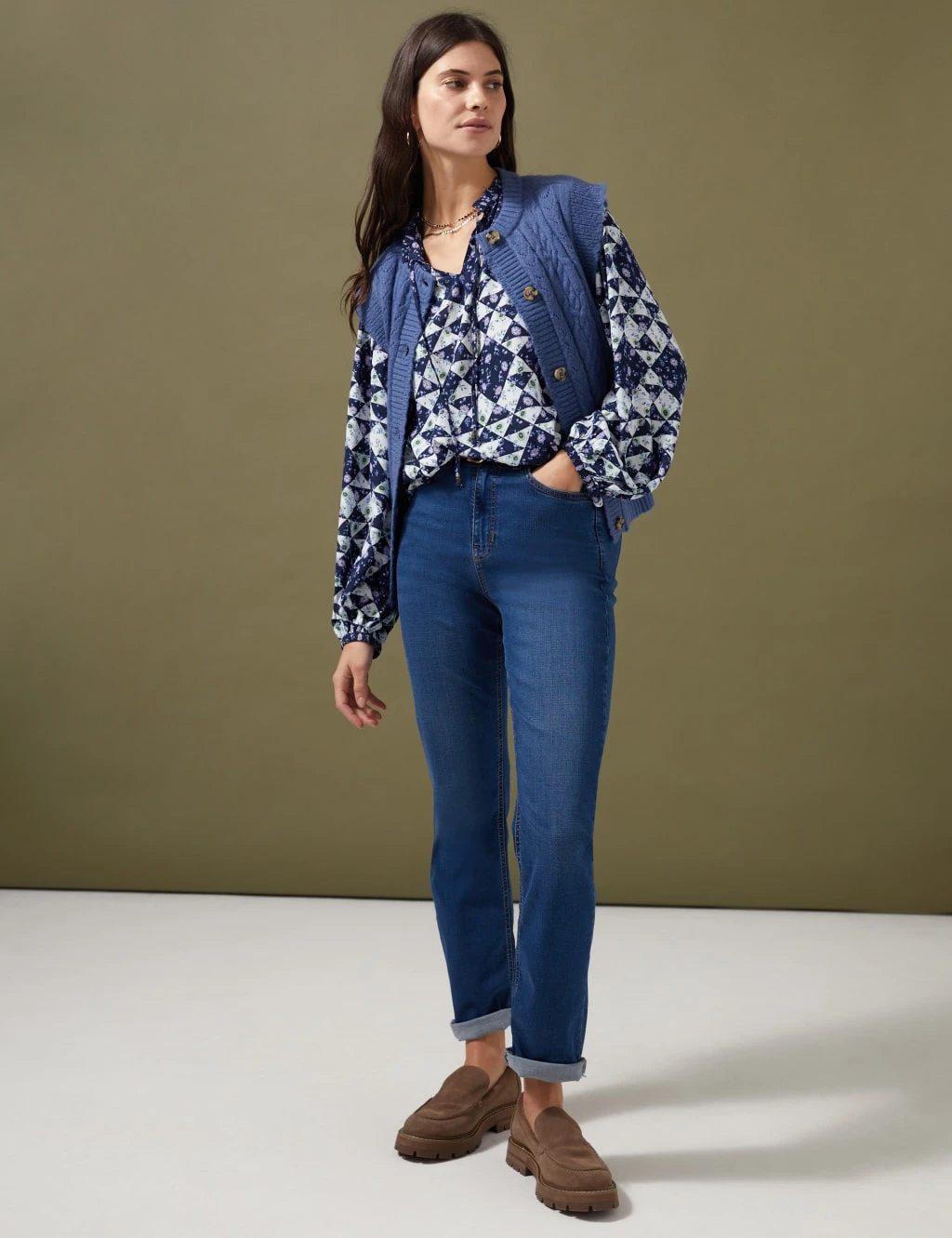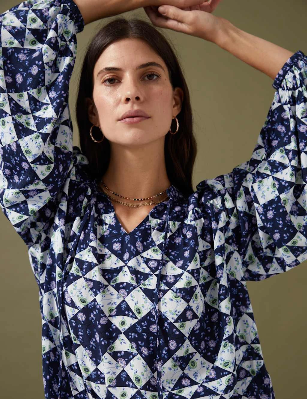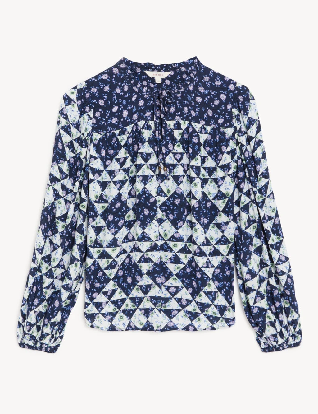 This Per Una blouse features a striking geometric print with a contrasting floral panel at the yoke. It’s crafted in a regular fit, with gentle volume created by the puff sleeves which have elasticated cuffs to hold them in place. The piece is finished with a frill at the collar and a dainty tie neck.