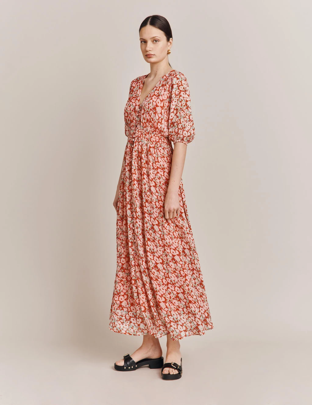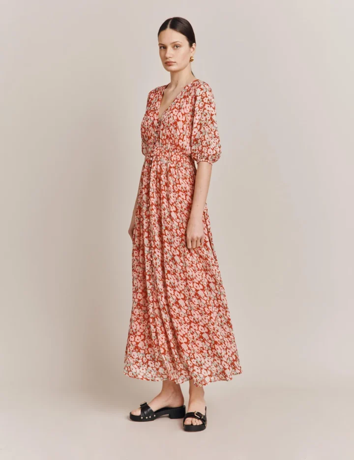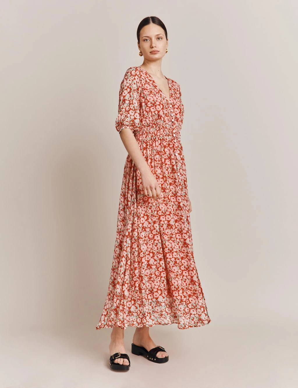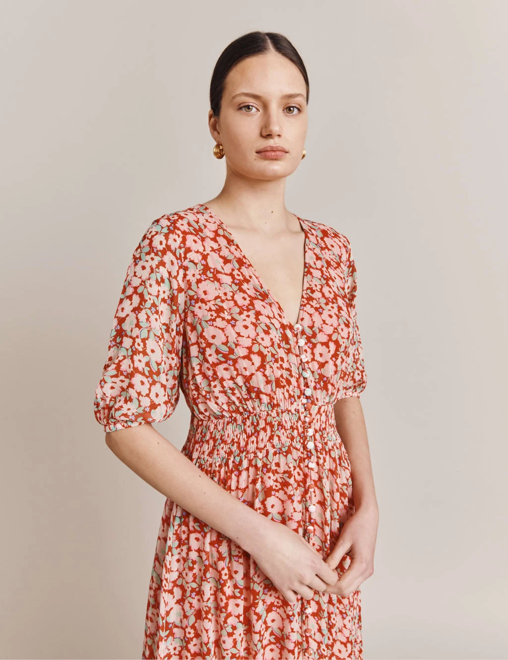 Upgrade your occasionwear with this striking floral dress from Ghost. It’s made in a comfy regular fit, with a flattering shirred waistband and an elegant v-neckline. This flowing maxi style features buttons down the front in matching fabric and neat short sleeves with stretchy cuffs.
