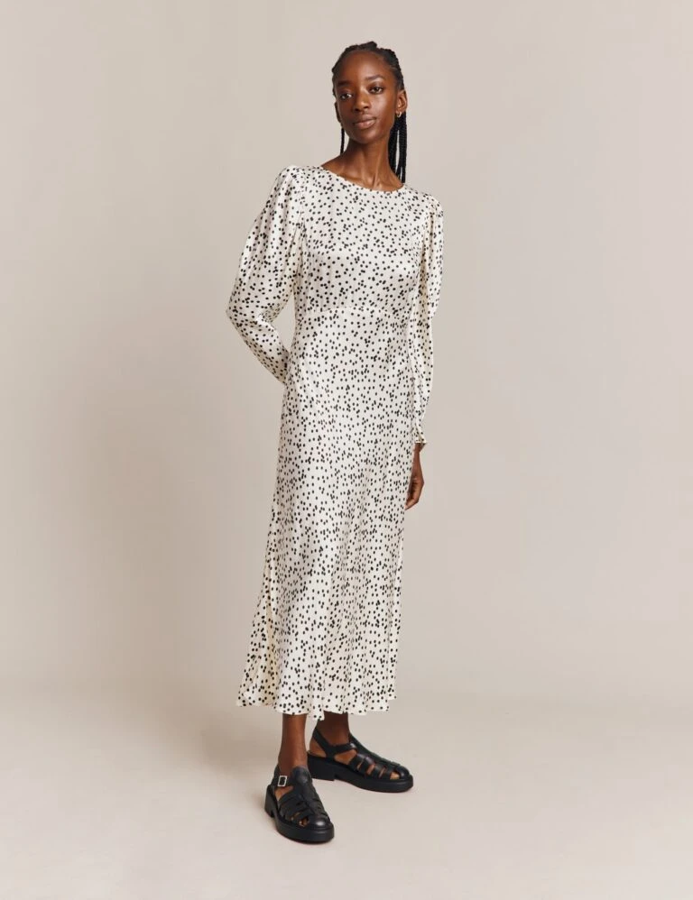 This polka dot dress from Ghost is an elegant choice for daytime occasions. It’s cut in a regular fit, with an easy round neck and a flattering waisted silhouette. The long sleeves are gathered at the shoulder for a touch of fullness, while the gently gathered skirt finishes at an on-trend midi length.