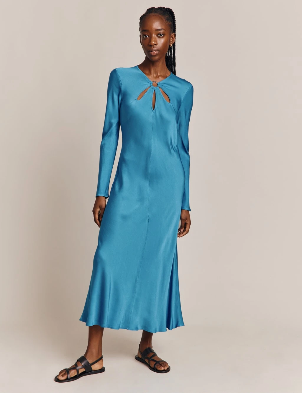 Smooth satin gives this Ghost dress an air of luxury. It’s cut to a regular fit, with an easy smock shape and a fluttery midi hem. Cut-outs and a central ring at the round neckline provide a striking focal point. Long, slim sleeves complete this classic piece.