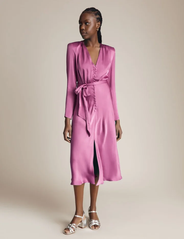 Made from luxurious satin, this midi waisted dress from Ghost is full of timeless elegance. It’s cut in an easy regular fit with long sleeves and a v-neckline. The design fastens with a neat row of covered buttons. Gathered detailing at the shoulders and a tie fastening at the waist complete the glamorous piece.