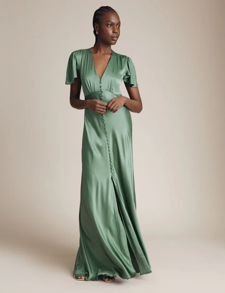 With its luxurious silky-smooth satin and maxi length, this Ghost dress captures a vintage-inspired elegance. It’s cut in a regular fit that gently skims the waist before flowing into a draping open-split skirt. Covered buttons down the front add to its graceful appeal, while fluttery angel sleeves beautifully frame its v-neckline.