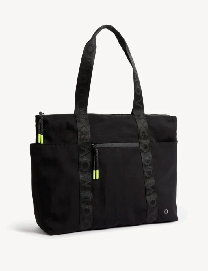 Keep your gym essentials organised in this tote bag from our Goodmove collection. Two shoulder straps and a secure zip fastening. Features an outer zipped pocket and two side pockets that are ideal for storing water bottles. A zipped compartment and slip pocket on the inside are perfect for securing your valuables. Our Stormwear™ water-repellent fabric helps keep your possessions dry.