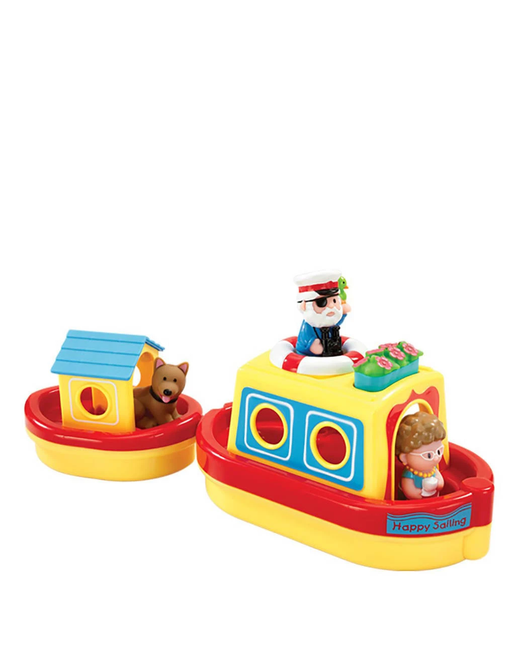 Little ones will love making up stories with this Happyland Water Lily Canal Boat. They can help the captain and his passenger take a trip along the canal in the colourful barge, with the little dog in his dinghy. This toy features push-along action and can float in the bath too. The set includes 1 barge, 1 dinghy, 1 sailor, 1 passenger and 1 dog. Happyland toys are designed for little hands and are perfect for imaginative play. Suitable for 18 months and over.