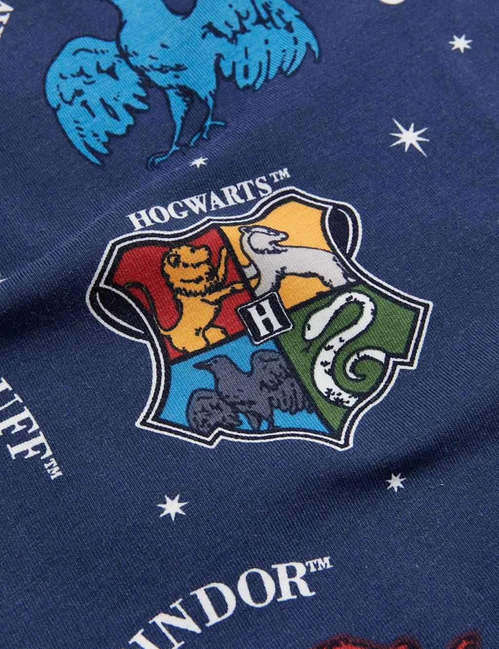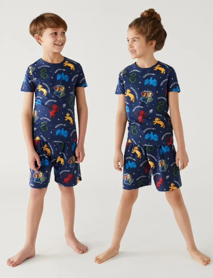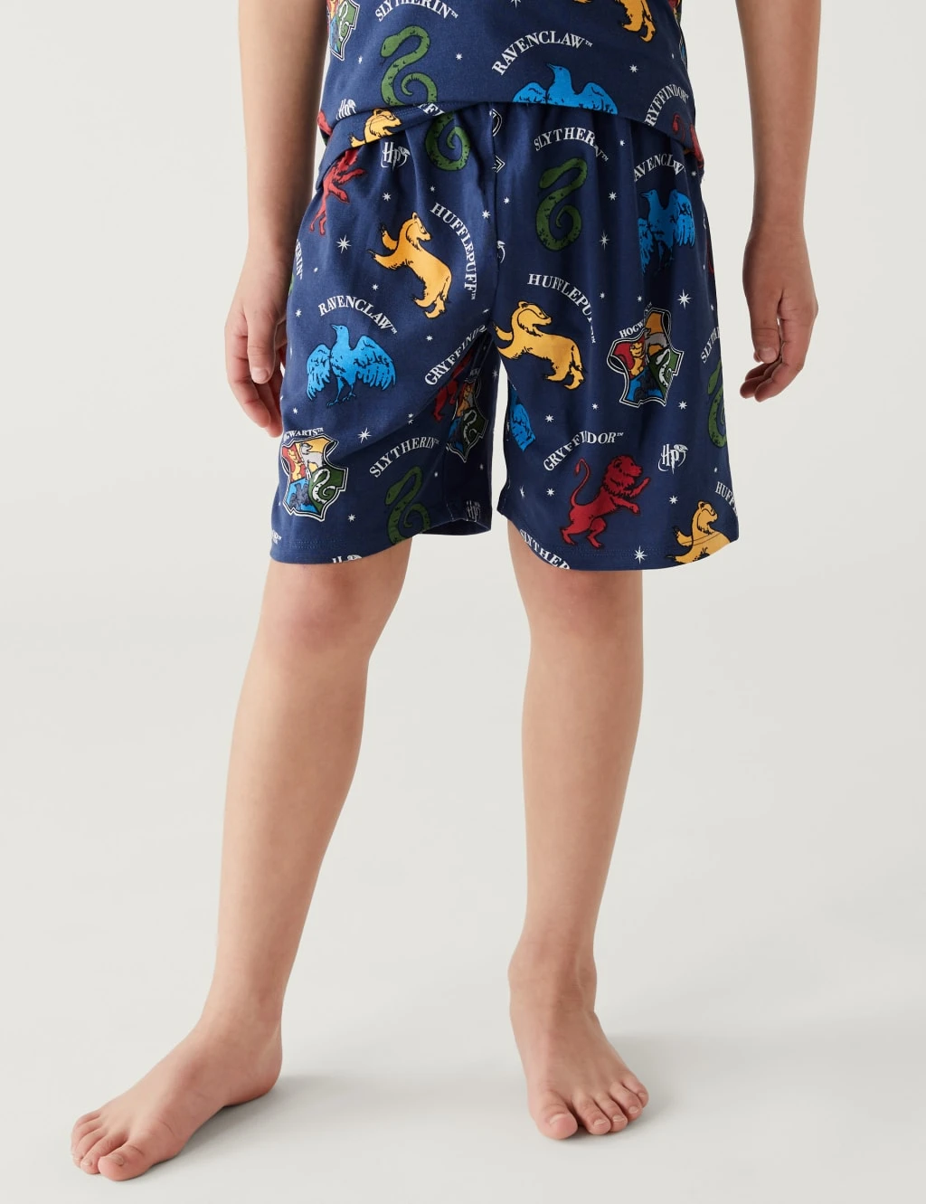 Bring a magical feel to bedtime with these cotton-rich Harry Potter™ pyjamas. The t-shirt and matching pull-on shorts are cut in a neat skinny fit. Made with added stretch for extra comfort. Decorated with a bright print featuring all the Hogwarts houses.