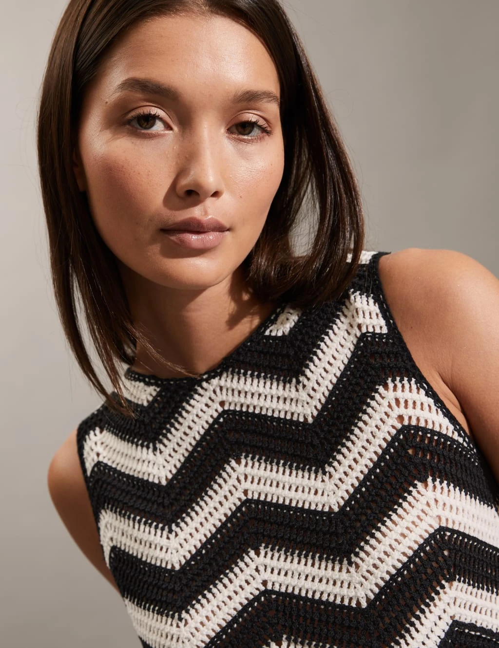Pack a punch in striking chevron stripes with this cotton-rich knitted vest by Jaeger. The sleeveless piece is made to a regular fit with a flattering crew neckline. It’s lined for comfort and coverage. Wear yours with light-coloured jeans, draping over the waist to show off the sculptural scalloped hem.