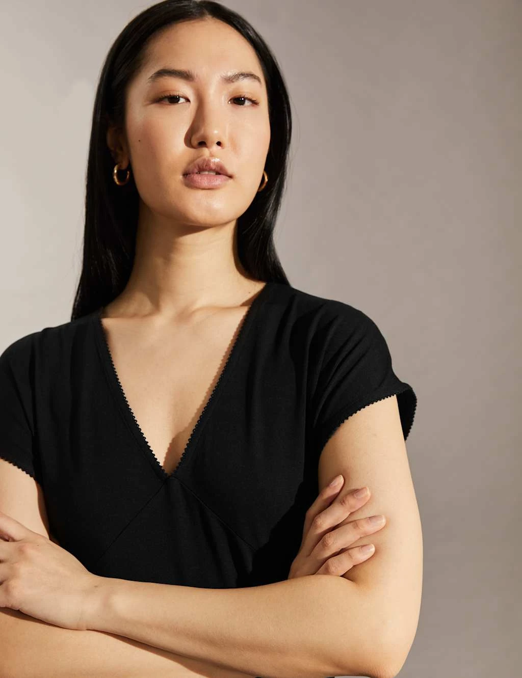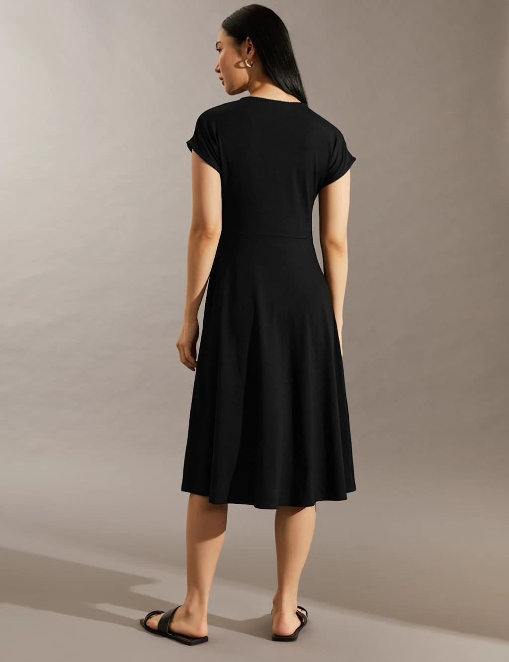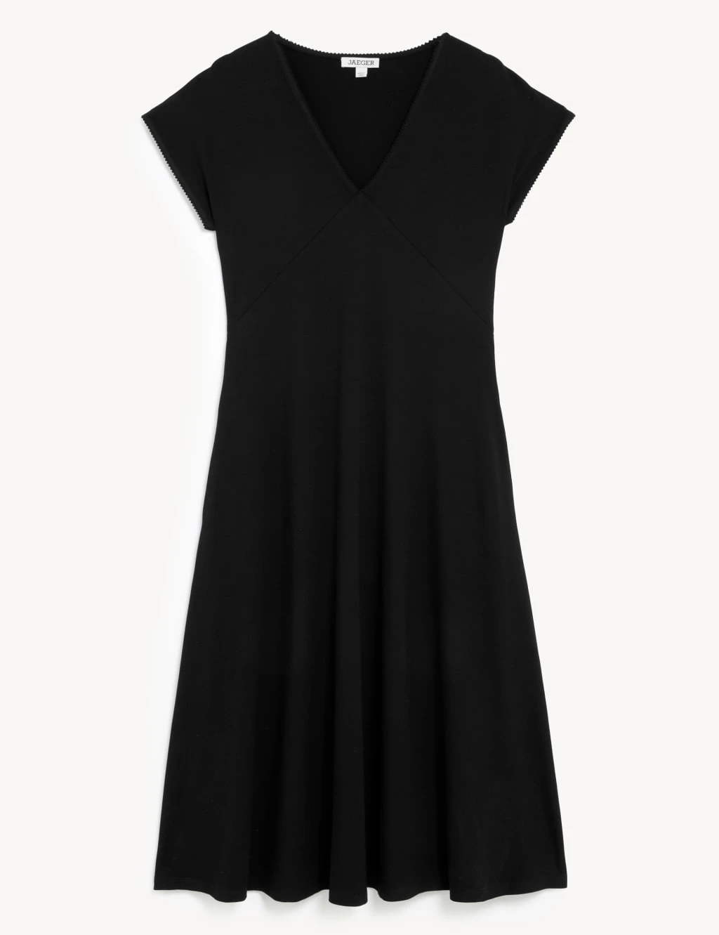 Soft jersey comfort meets elegant styling with this Jaeger tea dress. It’s cut to a regular fit, with a flowy midi skirt and low v-neckline creating a flattering silhouette. The short, grown-on sleeves drape effortlessly off the shoulders. Plenty of added stretch in the fabric ensures a flexible feel. Dress yours up with pointed heels.
