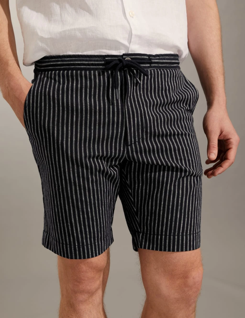 Made from a blend of linen and cotton with distinctive pinstripes, these Jaeger shorts have a soft, slightly textured feel. They’re cut to a tapered fit that’s relaxed through the seat and narrower through the leg and hem. A drawstring lends a laid-back quality to the shorts and allows you to adjust the fit at the waist. Finishing above the knee for a contemporary look, these shorts pair well with other modern separates such as a plain white t-shirt or a linen grandad-collar shirt.