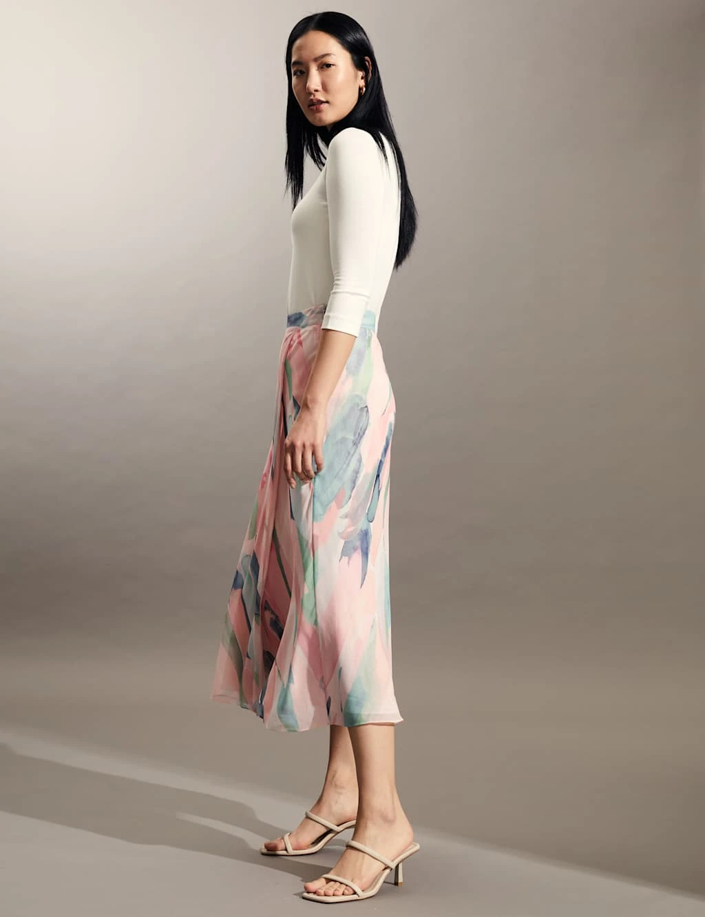 The delicate brushstroke print, unique to Jaeger, lends a distinctive feel to this skater skirt. The flowing georgette fabric is cut to a regular fit and sits at a flattering maxi length for an effortlessly stylish feel. Pair with the matching blouse for a fresh, feminine look.