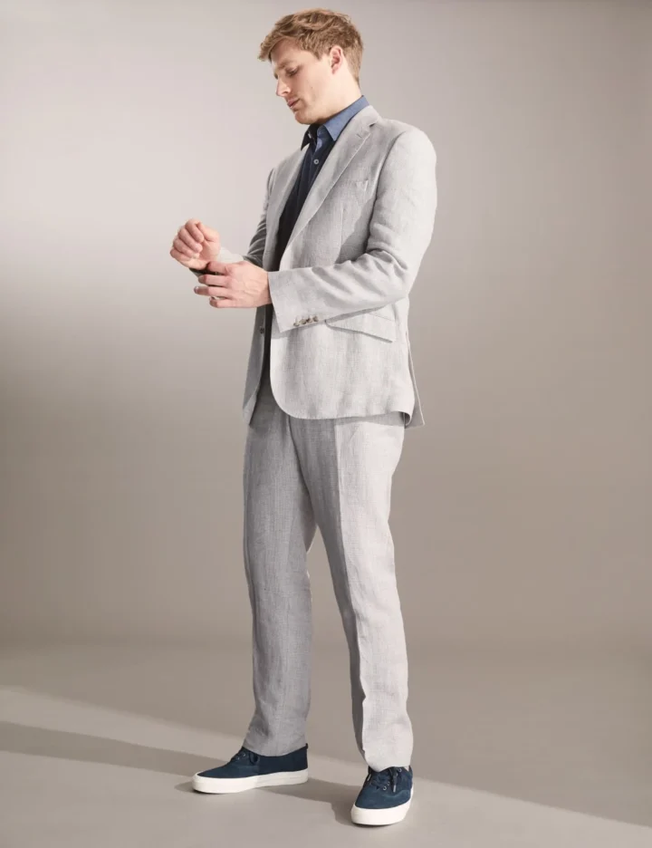 Smart style and breathable comfort go hand in hand with these Jaeger puppytooth trousers, made from luxurious pure linen cloth at Italy’s Emmetex mill. They’re cut to a tailored fit, with a modern flat front and sharp creases through the legs. The waistband features side buttons for adjustable comfort. Further tailored touches include neat Columbia stitching, back welt pockets and a coin pocket. Match yours with the coordinating jacket and a crisp white shirt for an elegant ensemble.