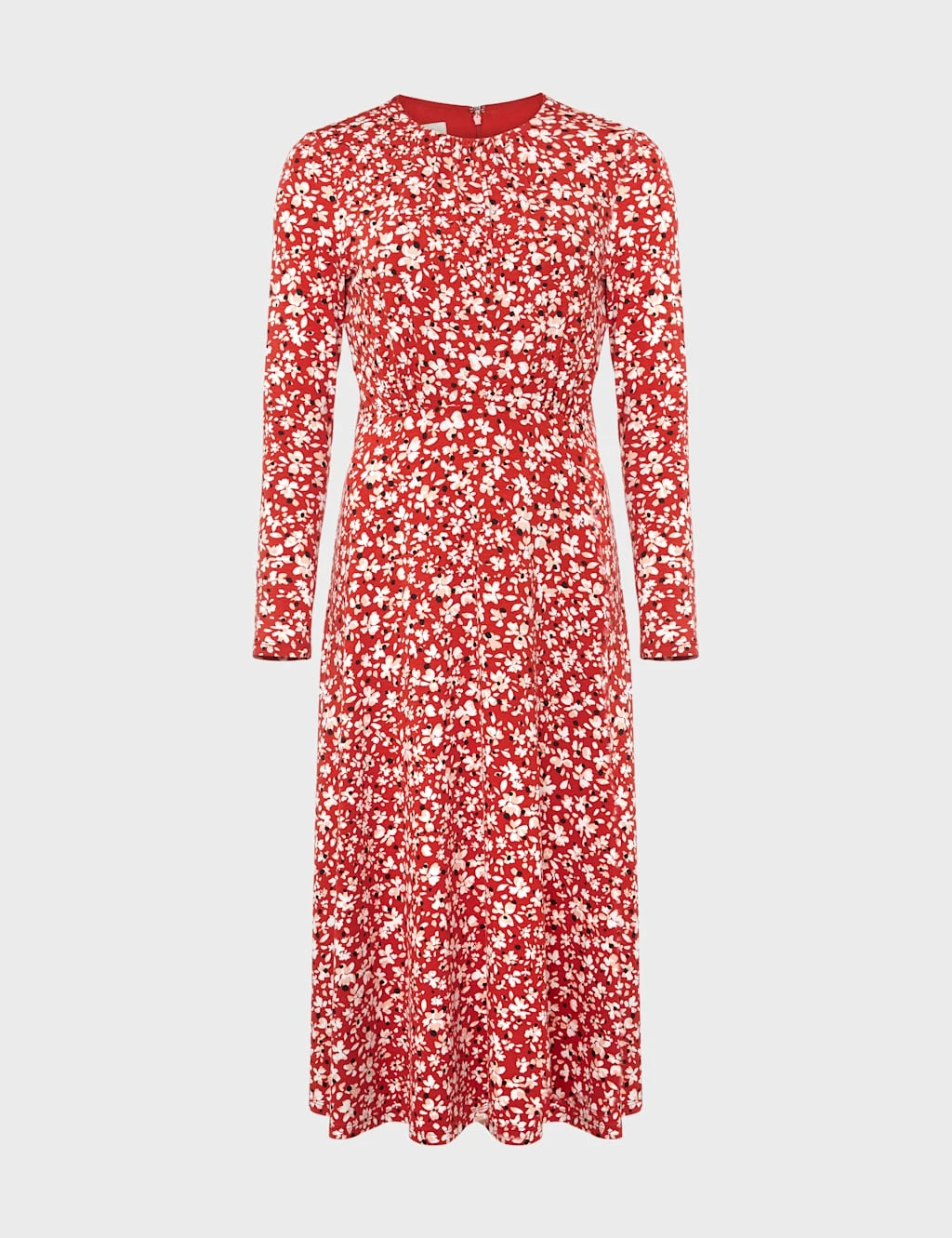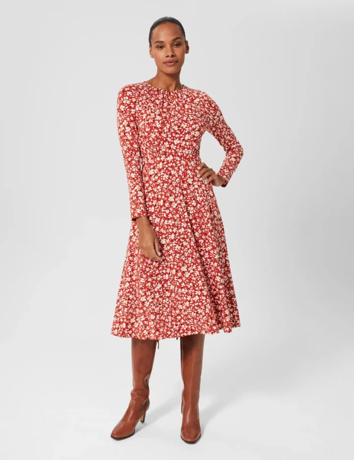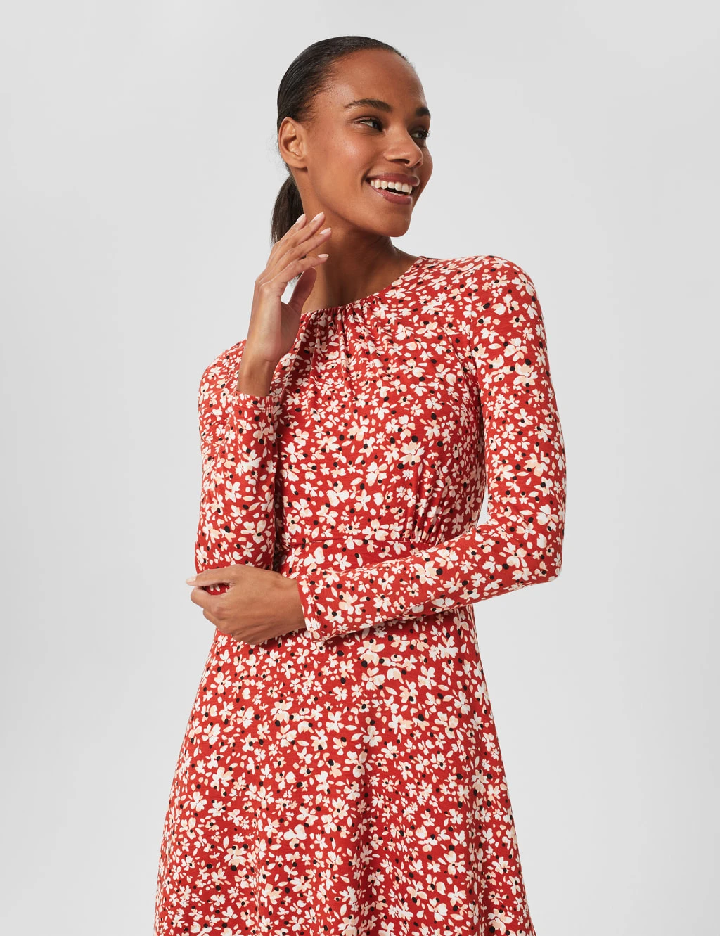 With its bold floral print, this jersey waisted dress by Hobbs makes a standout choice for daywear. It’s cut in a comfy regular fit, with neatly fitted long sleeves. At the crew neckline, gentle gathers add extra drape to the bodice. The hemline sits at an elegant midi length. This piece is lined for comfort and fastens with a discreet back zip.