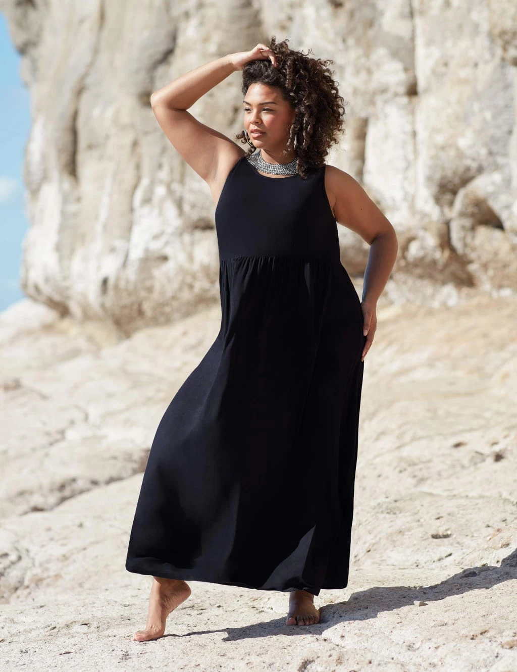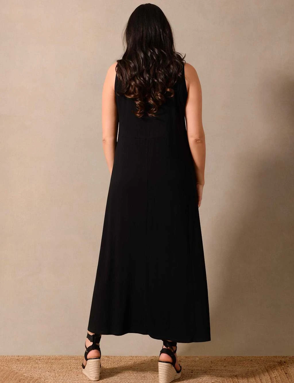 Dress up or down with this wear-anywhere dress by Live Unlimited London. The sleeveless style is made to a relaxed fit from soft and stretchy jersey fabric. Gentle gathering at the waist creates flowy movement in its maxi-length skirt. A scoop neckline adds a flattering finish.