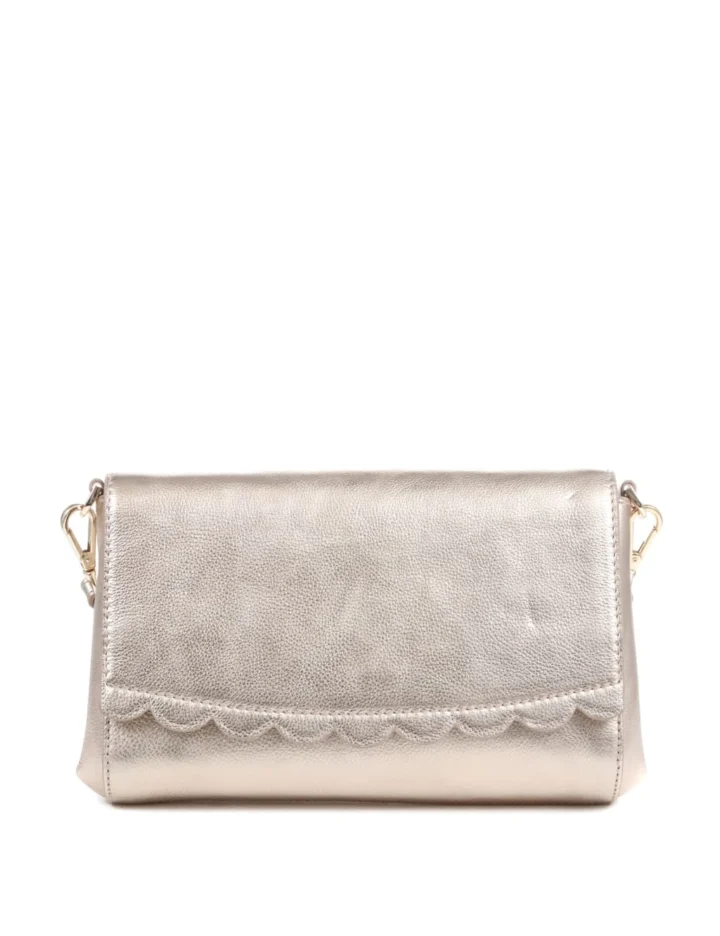 Go glam with this metallic leather clutch bag by Jones Bootmaker. Designed in a neat rectangular shape with pretty scalloped trims, it makes the perfect complementary accessory for evening looks. A detachable strap means you can style it as a clutch or wear across the body.