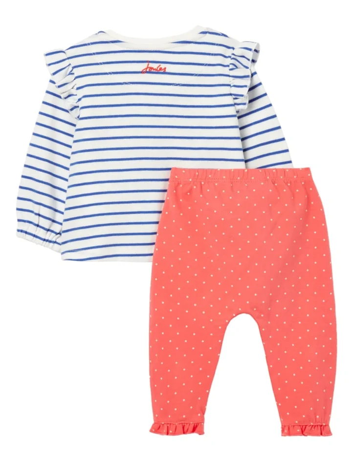 Dress your little one up in this sweet cotton-rich jersey outfit from Joules. The set includes a striped long-sleeved top and pretty polka dot leggings, both with frill detailing. Popper fastenings at the shoulder and a comfy elasticated waist make dressing easier. A colourful appliqué ladybird on the chest adds a playful finish.