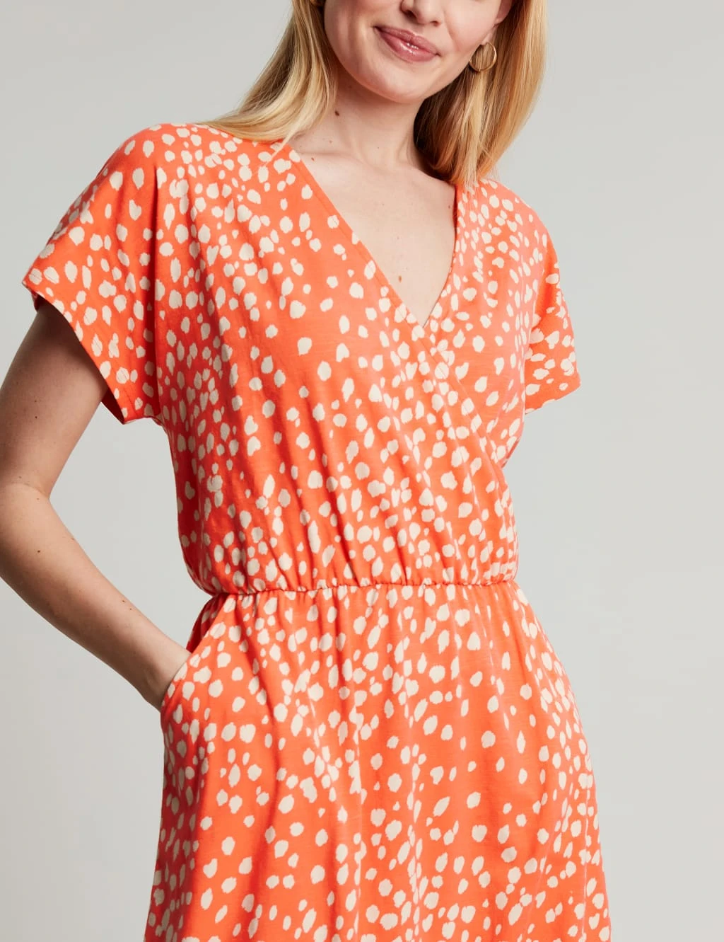 Crafted from comfortable cotton-rich jersey, this printed t-shirt dress from Joules is perfect for casual days out. It’s designed in a regular fit with a v-neckline and an elegant wrap front. Short sleeves add a relaxed, breezy charm, while the skirt falls from the gathered waist to a flattering midi length. Side pockets add a practical touch.