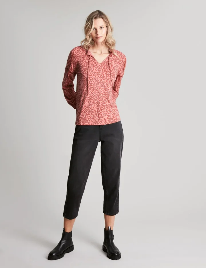 This blouse from Joules is crafted from flowing cotton-modal fabric for a beautiful drape. It’s designed in a regular fit, with a frill and tie at the flattering v-neckline. An animal print ensures a bold look, while cutwork inserts on the arms lend textural interest. The sleeves are gathered at the cuffs for extra volume and the brand’s embroidered hare adds a playful finishing detail on the hem.