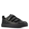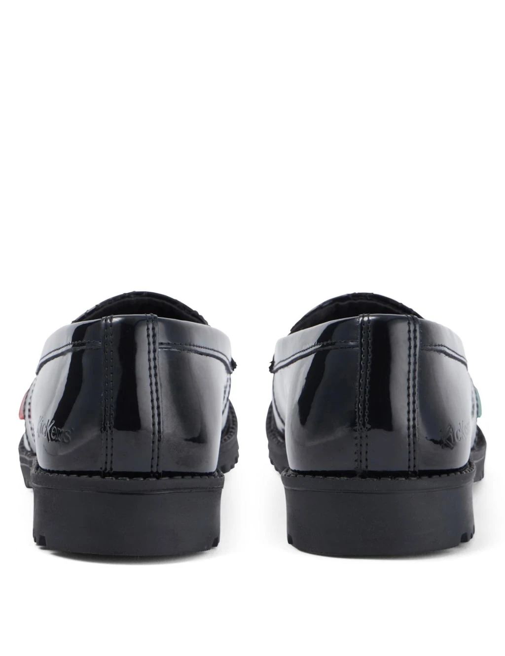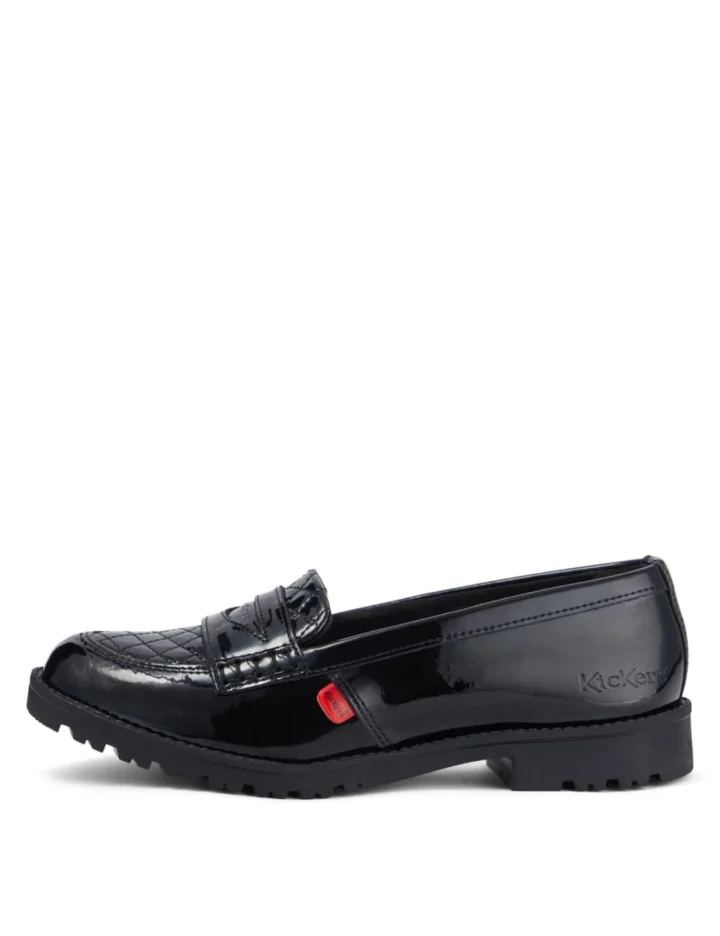 These patent leather school shoes from Kickers are made in a contemporary loafer shape that ensures a smart feel. They’re crafted in a comfy standard fit, in an easy slip-on style. Embossed branded cross-straps and quilted stitching over the toes give cool detail. Colour pop tab labels at the sides complete the look.