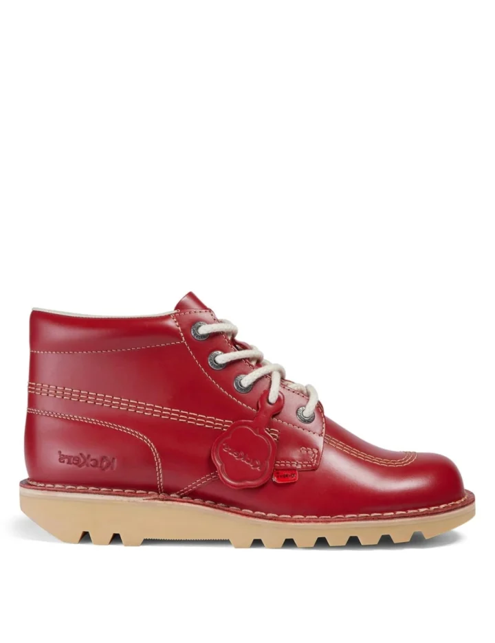 Add a bold flash of colour to your outfit with these lace-up leather boots from Kickers. With a sturdy rubber sole and padded ankle collar, they provide comfort and stability throughout the day. An embossed logo, metal eyelets, and contrast stitching and laces make for polished details.