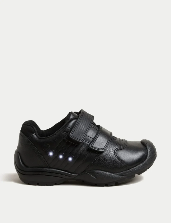 Add a bit more fun to every step with these light-up leather school shoes. They’re made with Freshfeet™ technology to keep odours at bay. A scuff-resistant finish ensures they stay looking good as new, while non-marking soles are kind to floors. The shoes provide all-day comfort with their squidgy underfoot foam and soft collar padding, and feature a recycled lining and sock. Two riptapes and elastic laces for easy on and off. Made with responsibly sourced leather. Complete with on/off switch for the lights.