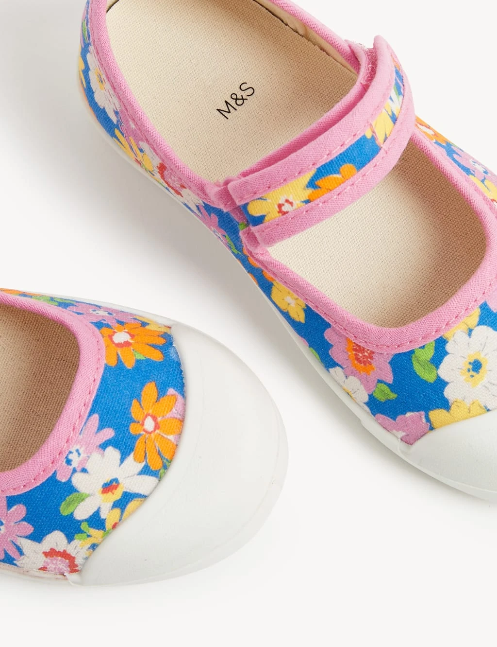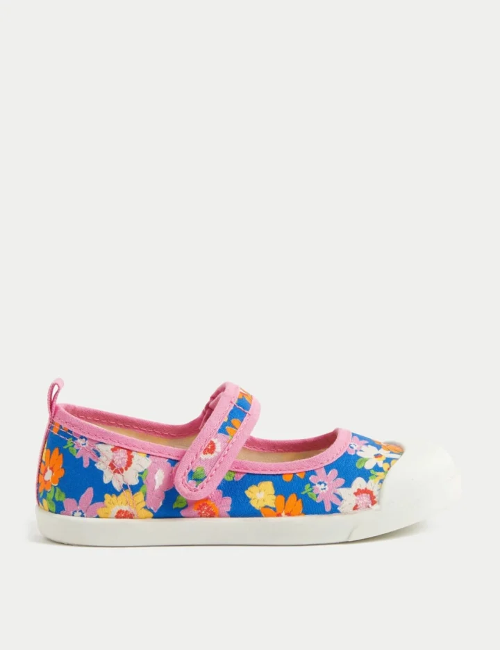 Printed with pretty flowers, these Mary Jane pumps are a colourful way to finish their outfits. Riptape fastenings offer an adjustable fit and easy dressing. Round rubber toes for a classic shape.