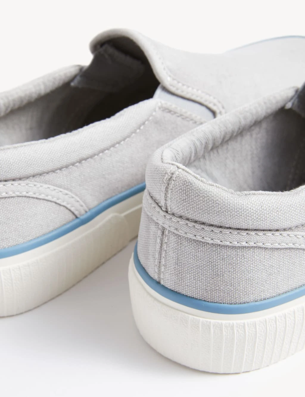 Kids will love the cool, casual style of these canvas slip-on pumps. They feature a deep cupsole with a contrast stripe. A soft ankle collar ensures comfort, while a textured sole gives grip.