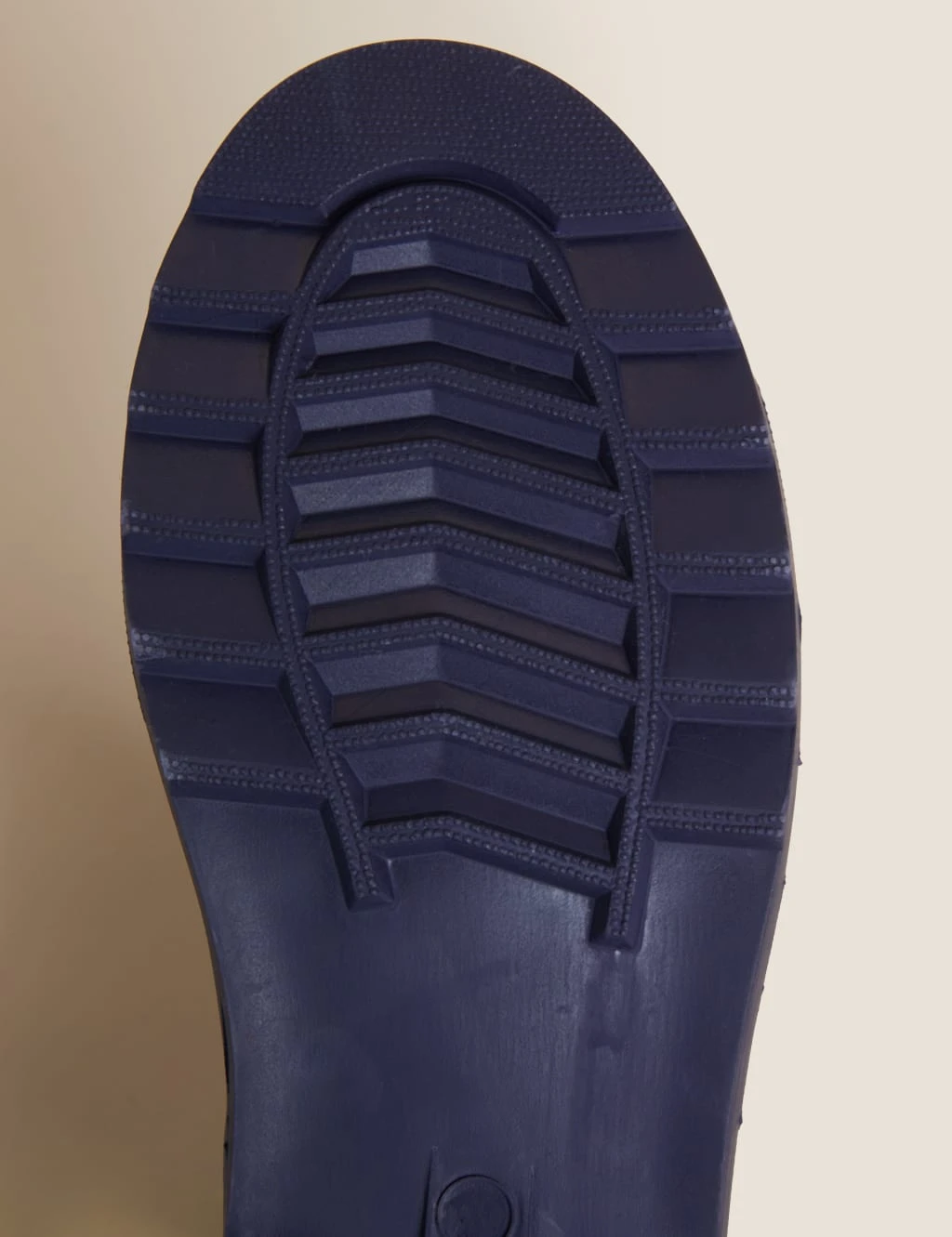 These floral wellies are perfect for muddy weekend walks. Designed with a handy pull tab and contrast striped cuffs. This product is vegan.