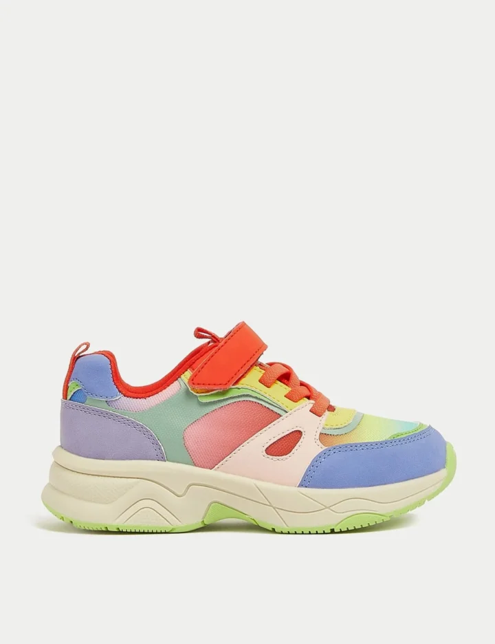 Kids can wear the rainbow with these fun colour block trainers. Featuring riptape fastening for easy dressing and thick soles for support. Finished with Freshfeet™ technology to help combat odour-causing bacteria.