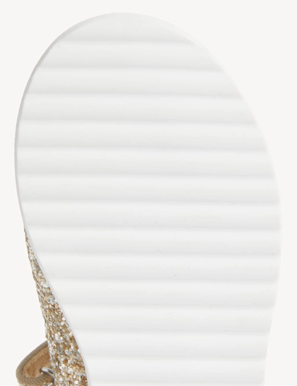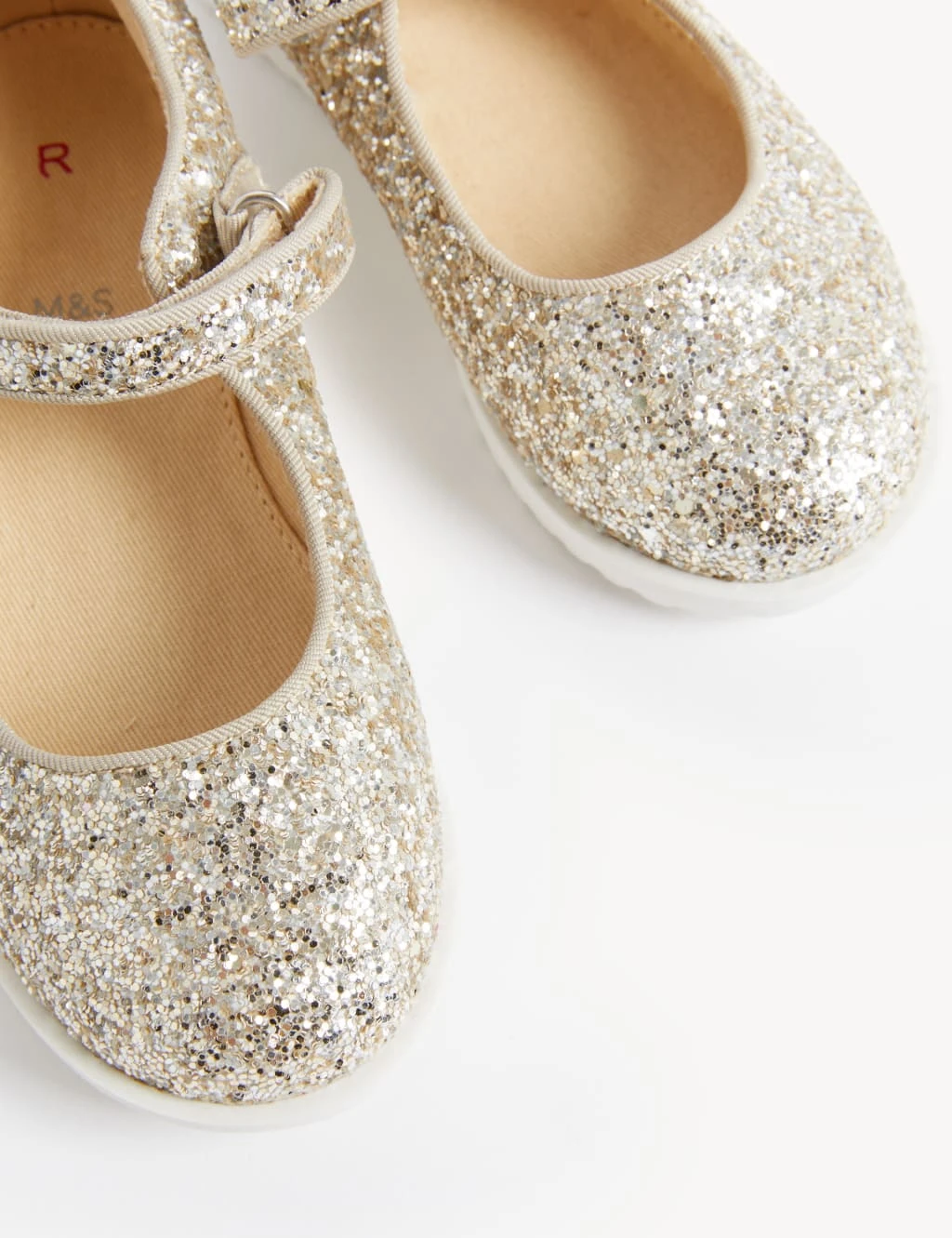 Your little one will sparkle all day long in these glittery Mary Jane shoes. Designed with a simple riptape fastening that will help them dress on their own. Finished with a classic round toe and a chunky sole to help support their feet.