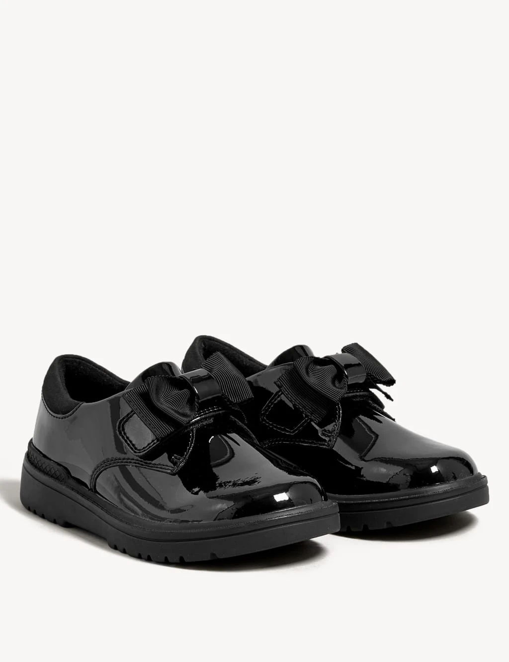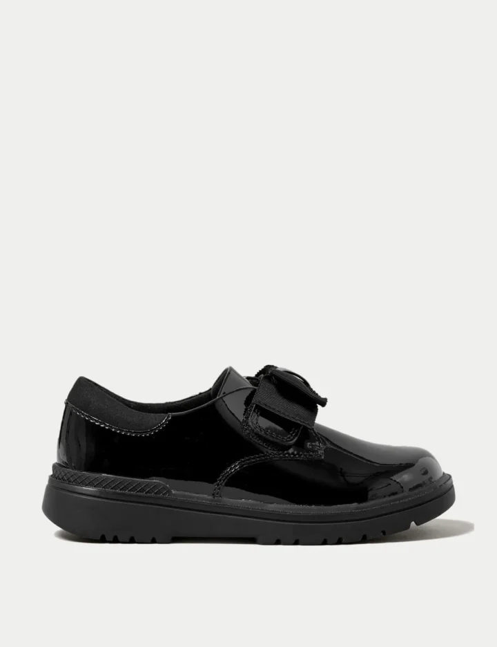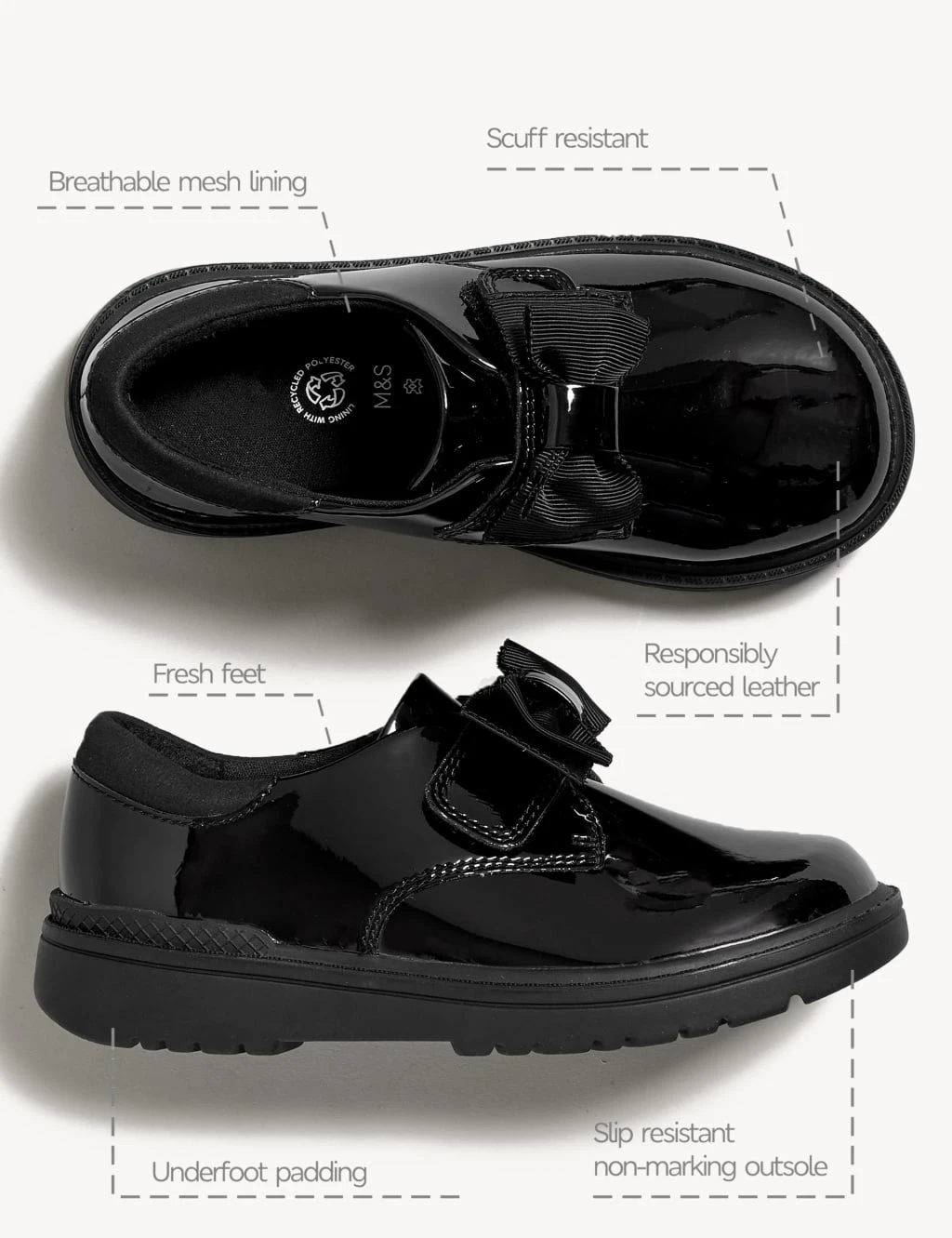 With their shiny patent finish and pretty bow front, these leather school shoes will be a hit with kids. Riptape fastening for easy dressing. Low wedge heel, made with non-marking soles to protect floors. A squidgy foam insole and soft collar padding keep young feet feeling comfy all day, while our antibacterial Freshfeet™ technology works to keep odours at bay. We’ve added a scuff-resistant coating to keep their shoes looking newer for longer. Made with a recycled polyester lining, and responsibly sourced leather.