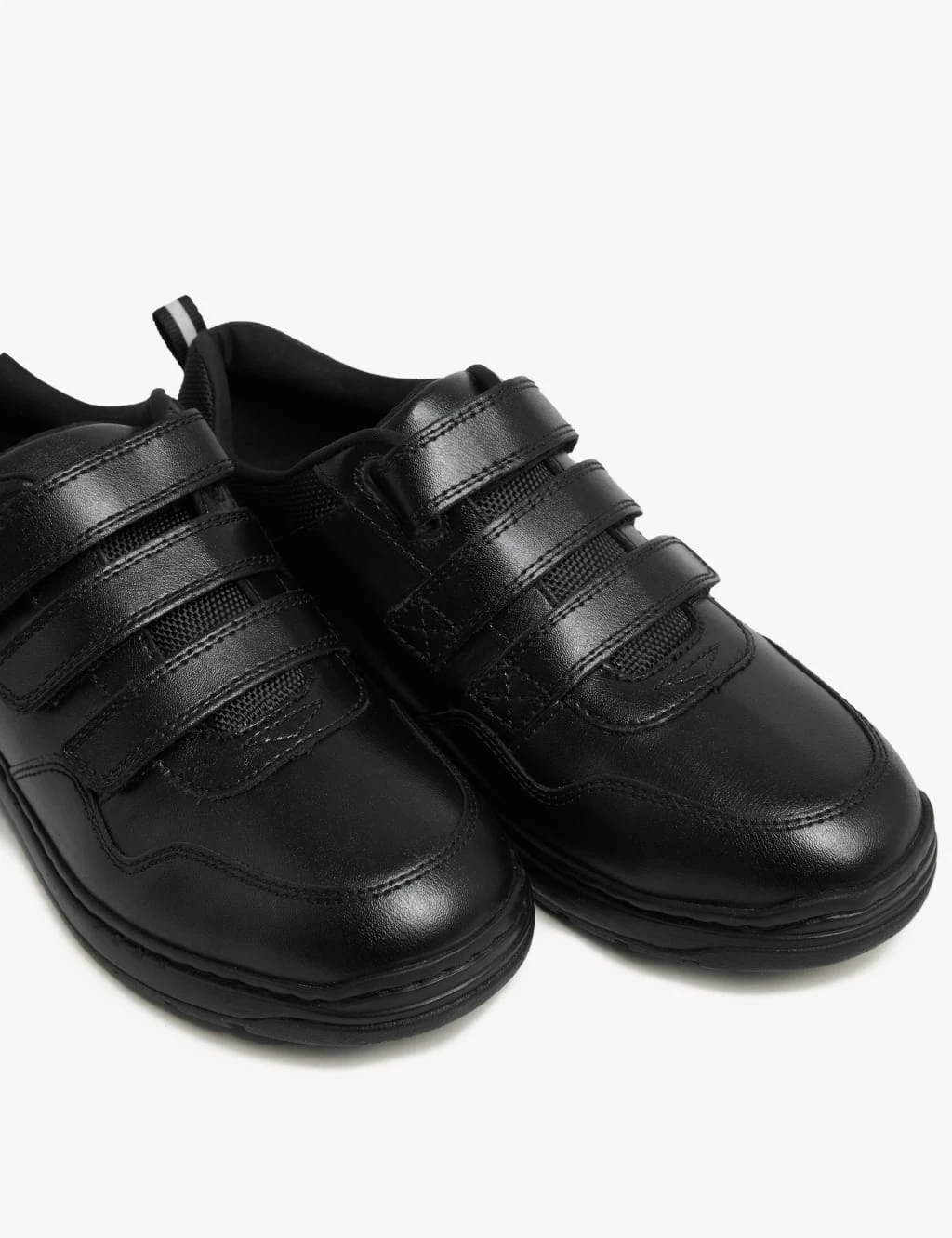 These leather school trainers are comfortable as well as stylish. Soft padding at the collar and a squidgy foam underfoot provide support, while Freshfeet™ technology fights the bacteria that can cause odours. A scuff-resistant coating protects them from bumps so they look newer for longer. Plus, the lining and sock are crafted from recycled materials. Made with responsibly sourced leather.