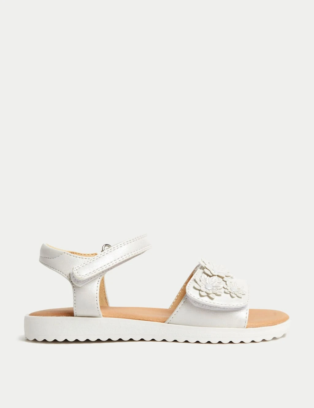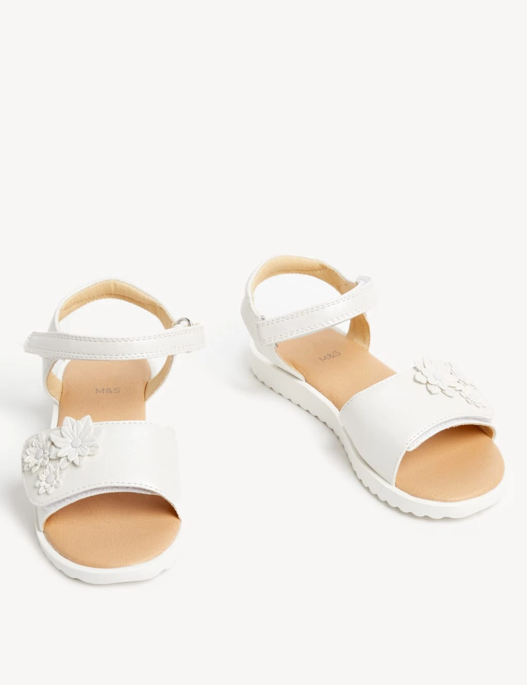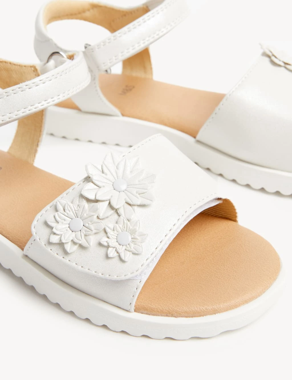 These kids’ sandals are perfect for warm-weather occasions. Designed in a regular fit with a comfy flat footbed. Riptape fastenings on the ankle and toe provide a secure fit. Appliqué flowers add a pretty touch.