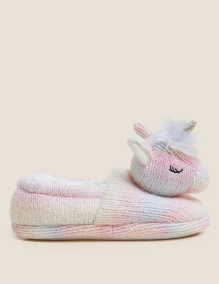 Bring extra magic to relaxed days with these knitted unicorn slippers. Cosy lining for extra warmth. Plus, they feature 3D unicorn heads at the front for a playful finish.