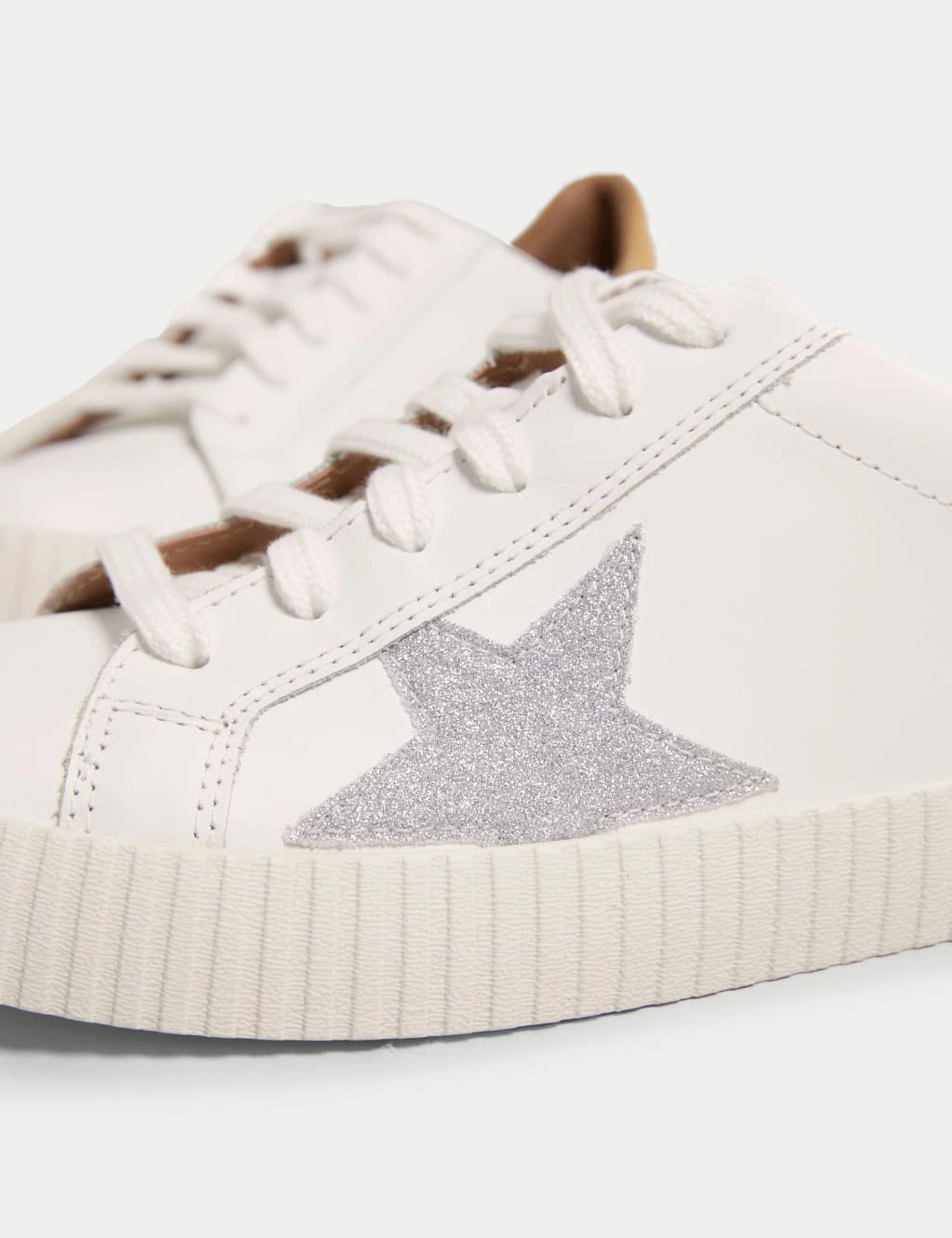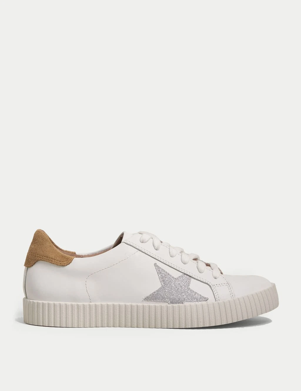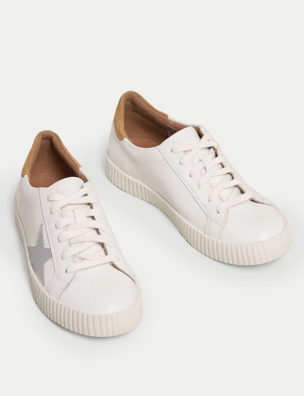 There’s a vintage-inspired feel to these leather trainers, with their deep outer sole and metallic star motif. Classic lace-up design, with a striking contrast suede detail at the back. Insolia Flex® technology positions your feet perfectly for day-long comfort. Made with responsibly sourced leather. M&S Collection: easy-to-wear wardrobe staples that combine classic and contemporary styles.