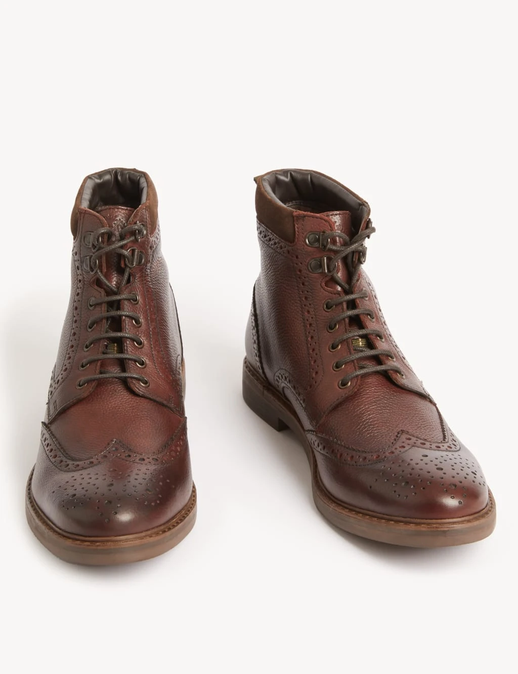 Finish off your daytime look in classic style with these leather brogue boots. They have a comfortable low block heel, and lace-up detail on the front and intricate brogue eyelets offer a timeless appeal.