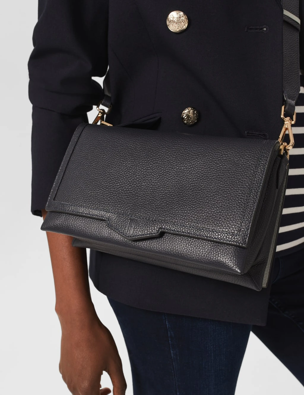 This luxe leather bag by Hobbs is a neat and stylish option for everyday wear. It comes in a compact rectangular shape with a convenient magnetic closure and a zipped interior compartment. The strap is adjustable and detachable, allowing you to wear it across the body or as a clutch bag.