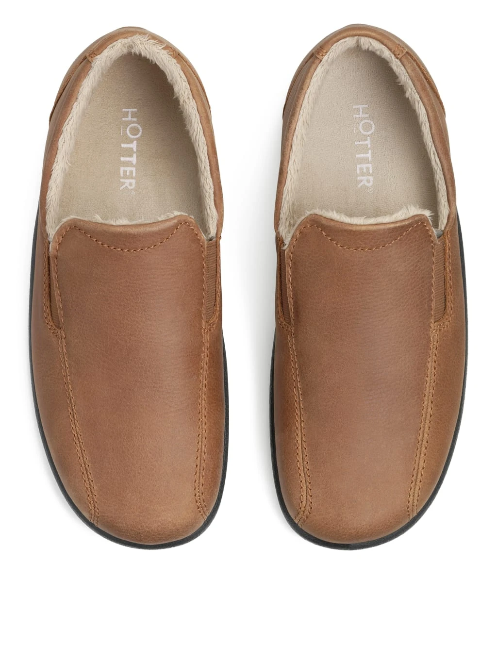 Step into cushiony comfort with these leather slippers from Hotter. This easy slip-on design features a breathable OrthoLite® insole to keep feet feeling cool and supported. Faux fur trims inside add an extra touch of cosiness.