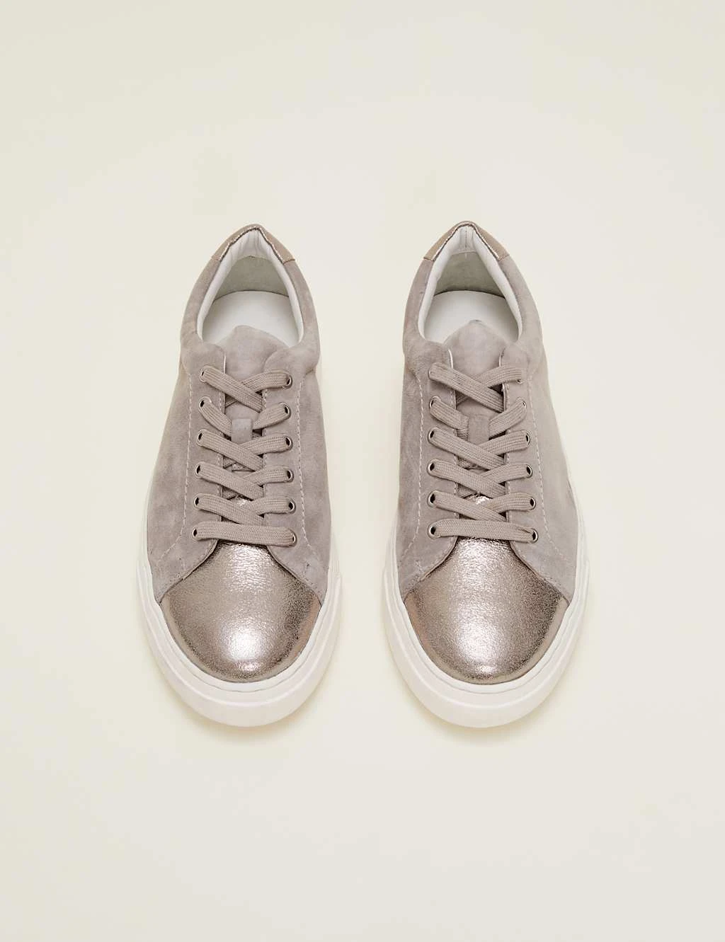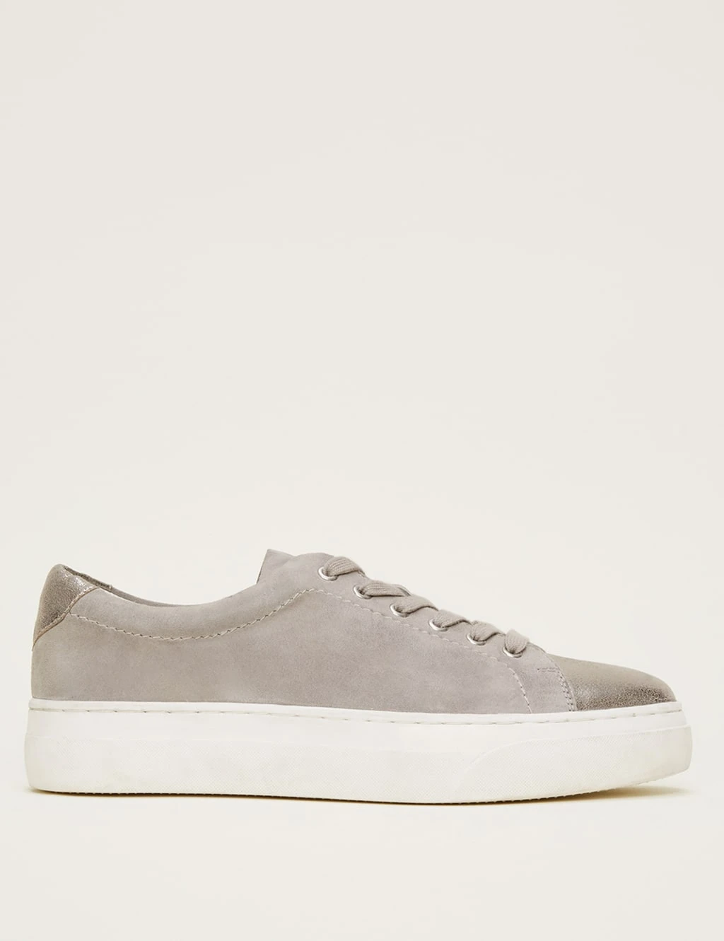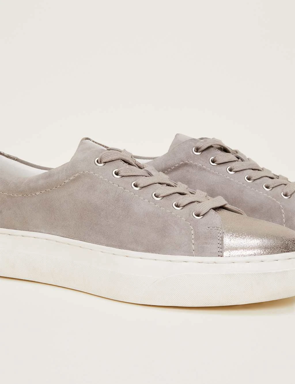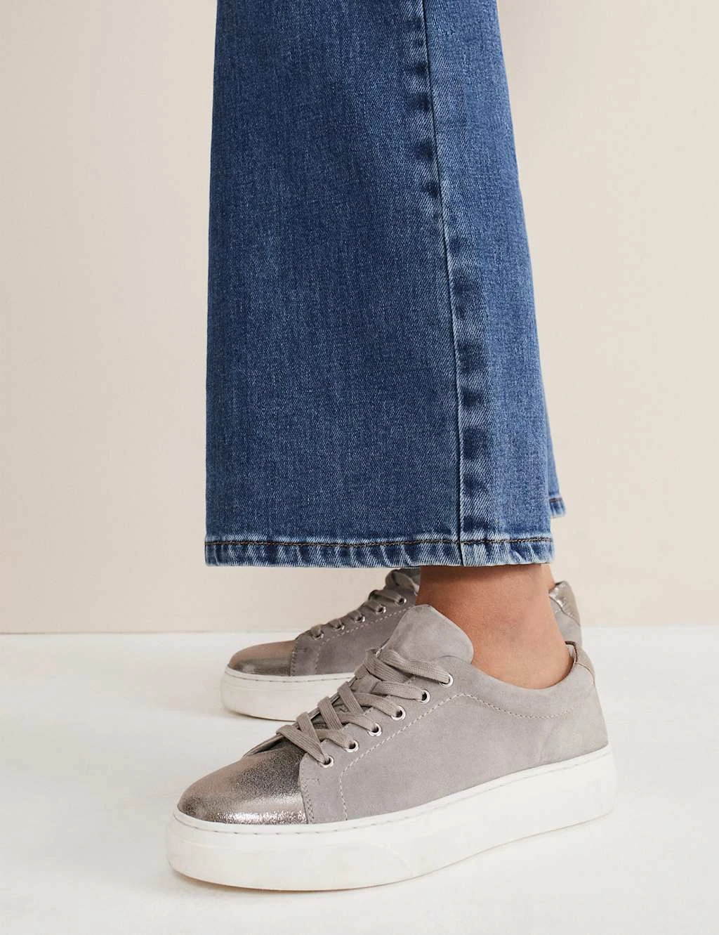 Bring some shine to your outfit with these stylish leather suede trainers from Phase Eight. This lace-up style features an on-trend chunky sole. Contrast metallic detail at the toe and heel creates a contemporary finish.