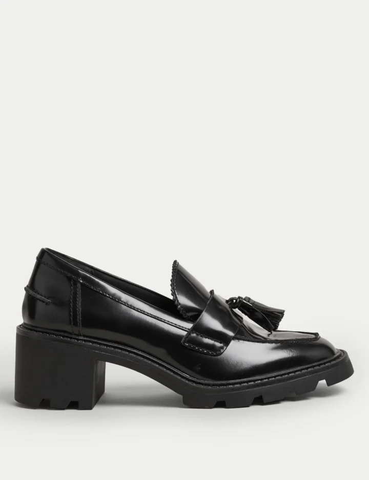 When you need smart shoes, these shiny leather loafers step up. The mid-block heel and cleated sole give this slip-on style a contemporary chunky look. Tassels at the front add playful detail. Insolia Flex® technology ensures correct foot placement for comfort and antibacterial padding gives a fresh feel.
