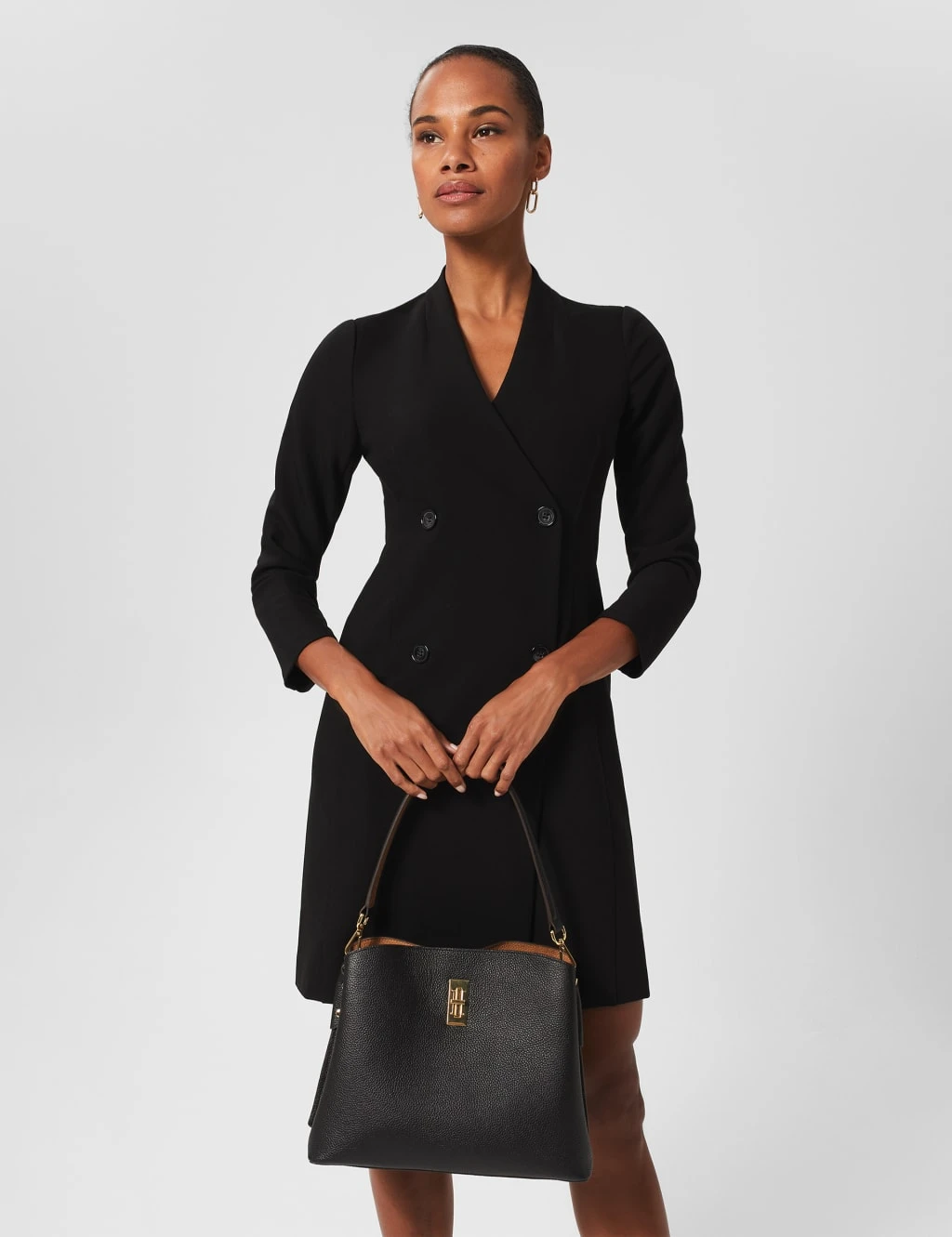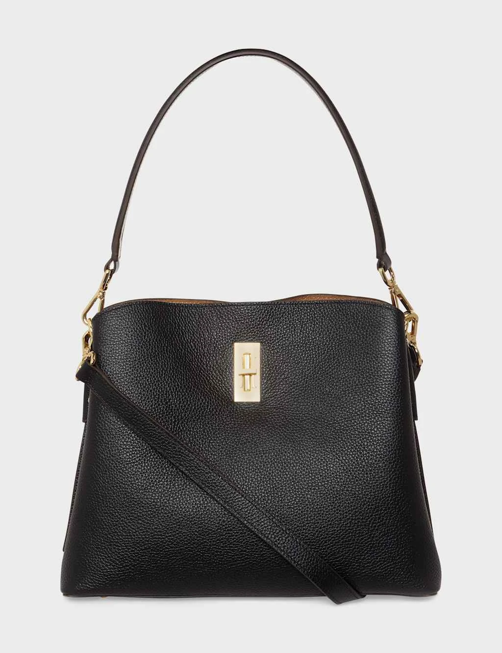 Opt for elegance with this Hobbs shoulder bag. It’s made from pure leather with a pebble grain texture for added sophistication and features an easy turn-lock fastening. Carry this premium piece by the top handle or shoulder strap – both are removable for versatile wear. It sits on studded feet and features gold-tone hardware for luxe appeal. Unzip it to reveal a zipped central section, two side compartments and a secure pocket to keep all your belongings organised.